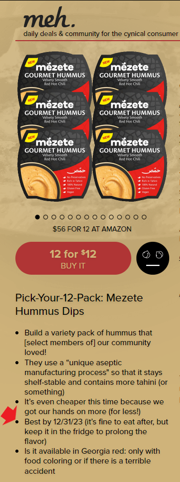 I ordered four 12 pack boxes of hummus on Nov.22, 2023 the product arrived December 1st. I was really excited to try the hummus. I ordered hot chili.roasted pepper and regular. I tried the hot chili first and thought it tasted kind of funny. Then noticed the expiration date. I thought oh that’s why it was so cheap. The product expires or Best buy date is December 2023. I certainly wouldn’t have bought four boxes of 12 each if I would have known they were going to expire in 30 days.