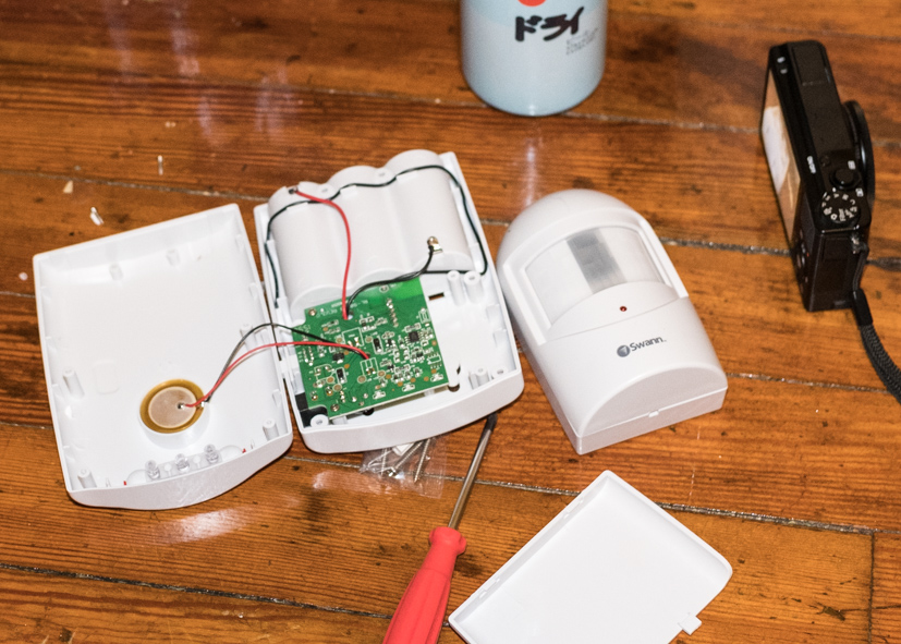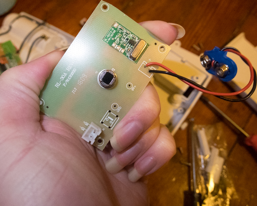I didn’t highlight this one because I’m absent-minded, but in the middle we have an HM312 pyroelectric passive infrared sensor, aka The Thing That Detects The Motion. To the right of it, or above it in this weird photo, is a PCB that’s been soldered into a hole on the main PCB? That’s kind of a fun alternative to a daughterboard, I suppose. Anyway, this thing handles the radio transmission, much like the daughterboard on the other unit.