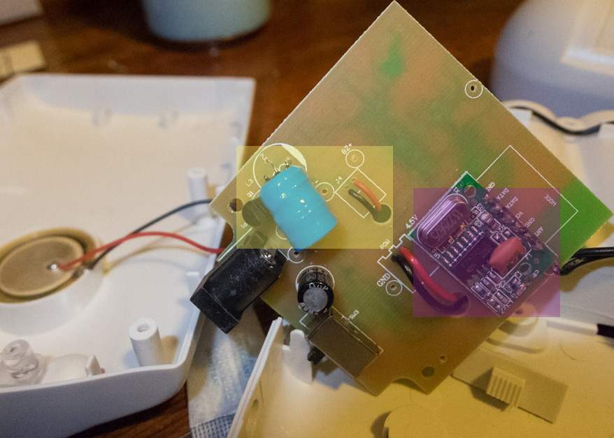 Urmm, hm. Well, the cap, the S8050 transistor (class b push/pull amp), and the wires in the yellow highlight are all bits of the BEEP BEEP part of this thing. The purple highlight is a daughterboard with a PT4303 heterodyne, an oscillator, etc., which are bits of the radio receiver. Neat. The other bit, the motion-sensy bit, it only has one free screw! What luck! But it isn’t falling apart… what’s this?!
