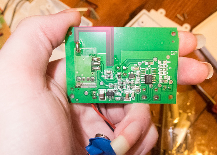 On the flipside, we have a bunch of tiny chips, they’re just dealing with the PIR sensor. The only interesting thing here (and that is a stretch) is highlighted in pink — no wires this time, the antenna for the transmitter is just a circuit trace.