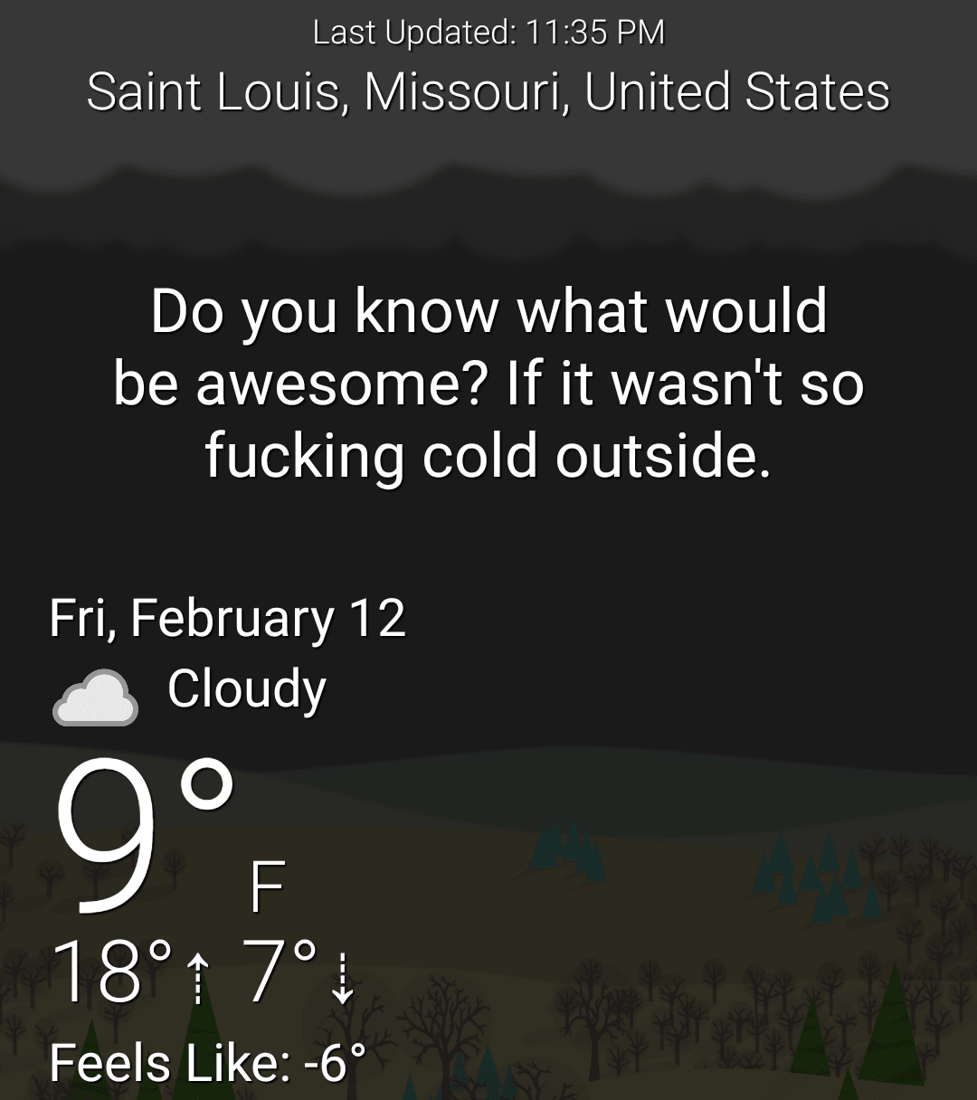 Hey TX you can take your weather back! Quit sending us this shit! (currently raining ice with flood warnings west of us)