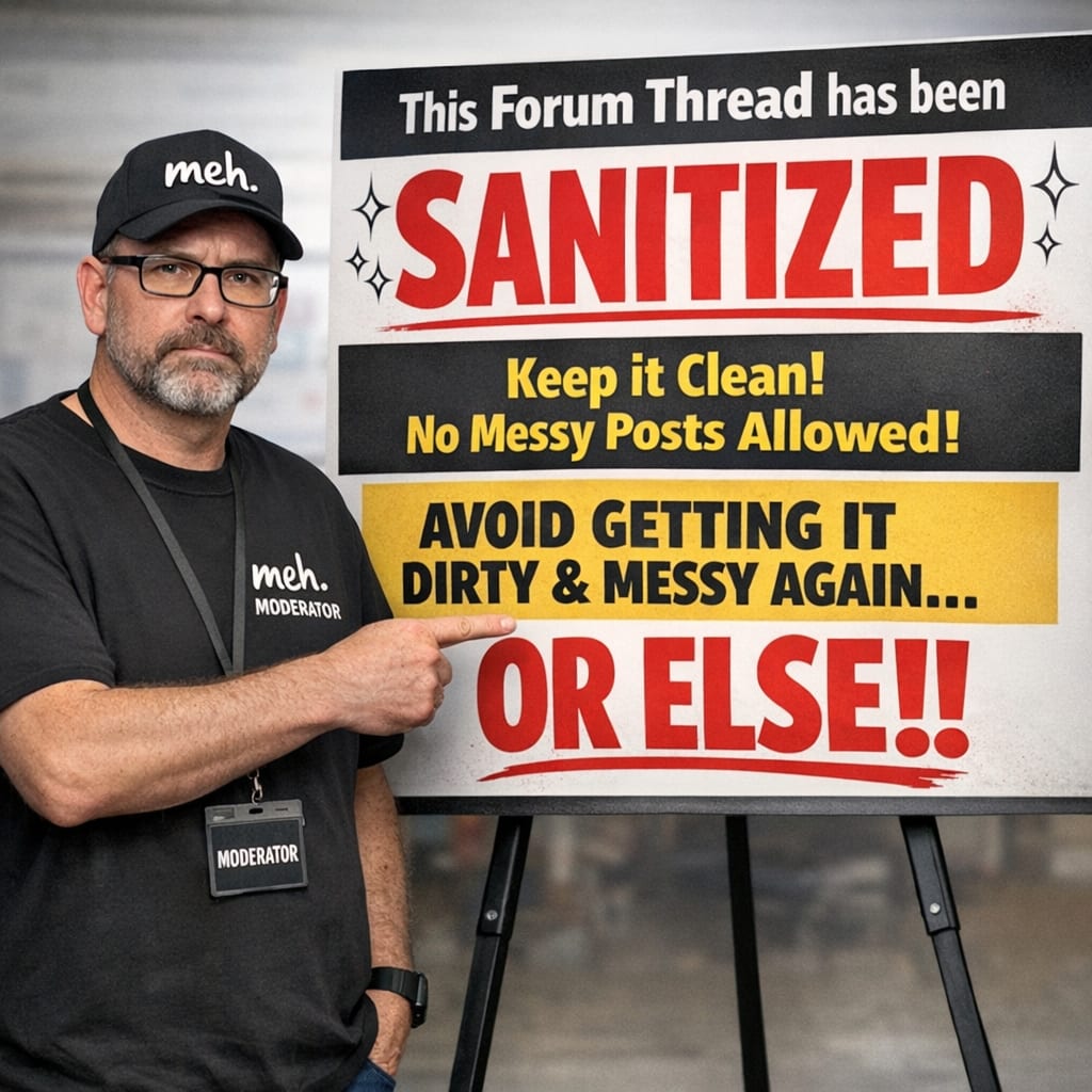 @MrGoodGuy Here’s the image you requested for “a moderator from meh pointing to a large sign that reads This Forum Thread has been SANITIZED and…”