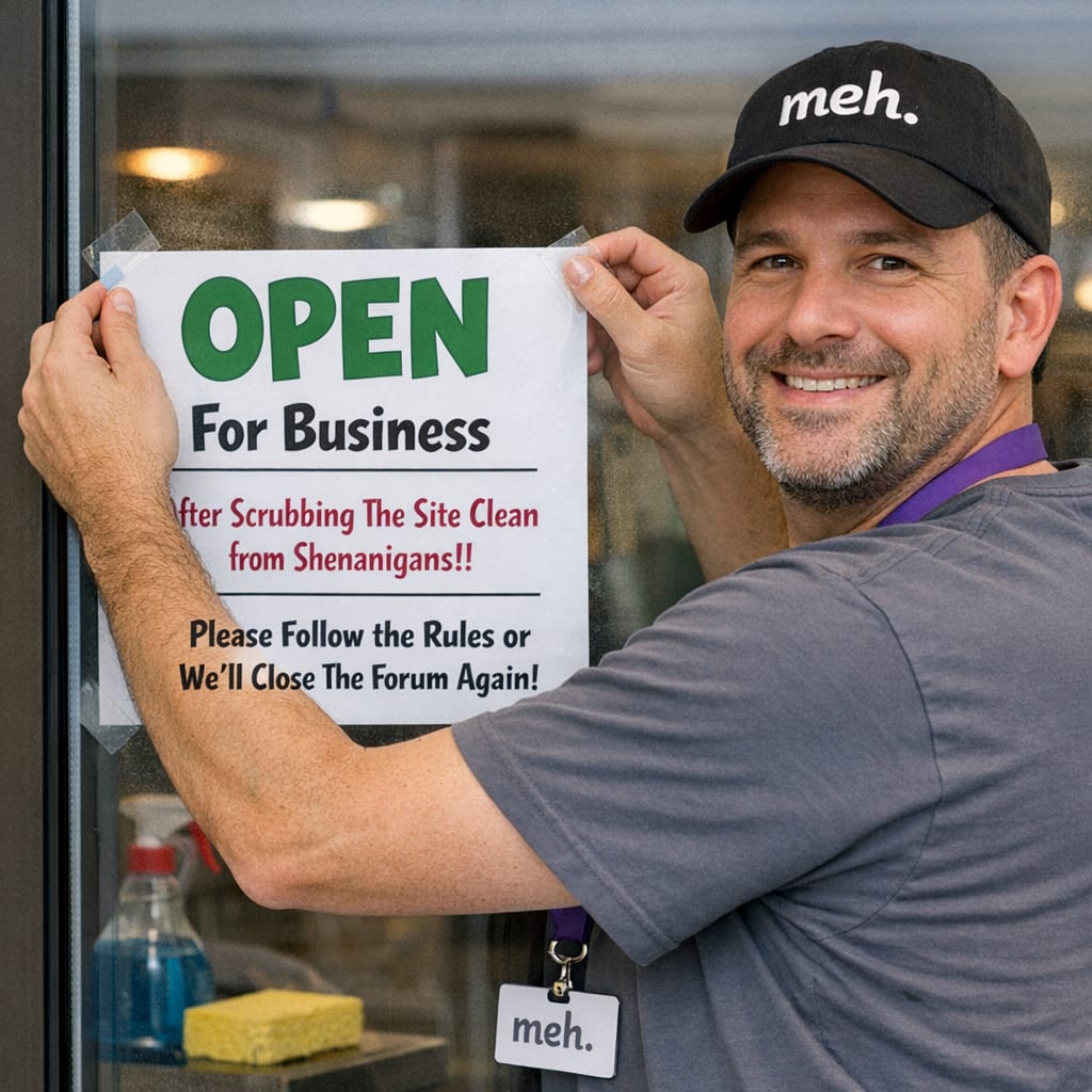 /showme a moderator from meh posting a sign on a window that reads “OPEN For Business After Scrubbing The Site Clean from Shenanigans!! Please Follow the Rules or We’ll Close The Forum Again!”.