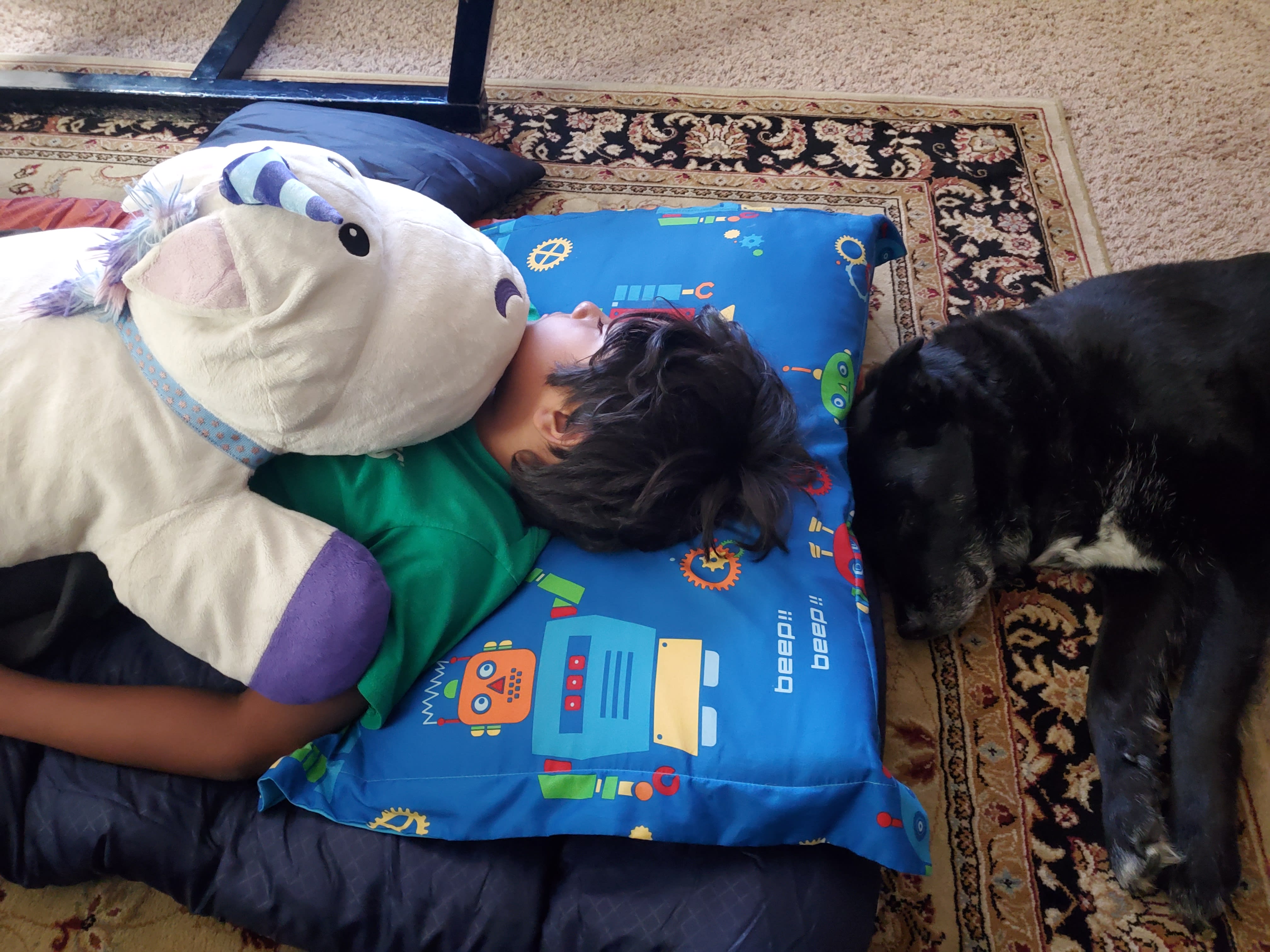 when he got home from surgery, it was easier to let him sleep downstairs. the kid decided he didn’t want his dog to sleep alone, so he camped out with him on the floor.