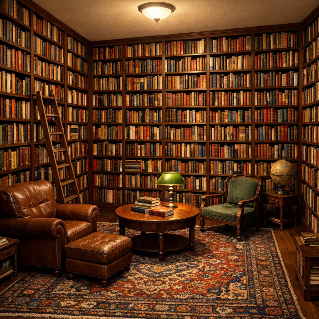 @cfg83 Here’s the image you requested for “room where every wall is full of shelves of books from floor to ceiling.”