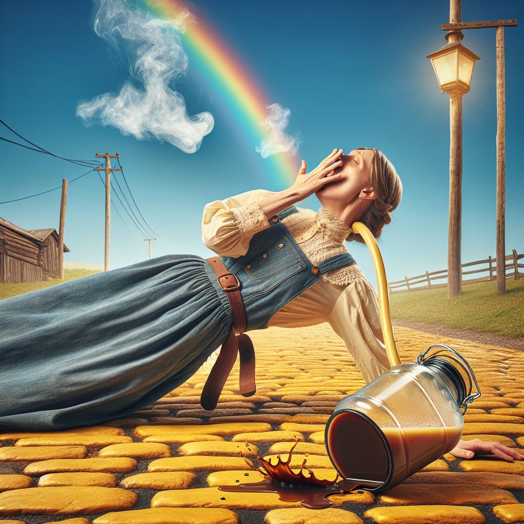 /showme Dorothy choking on a cold brew coffee while stumbling and falling on the yellow brick road.