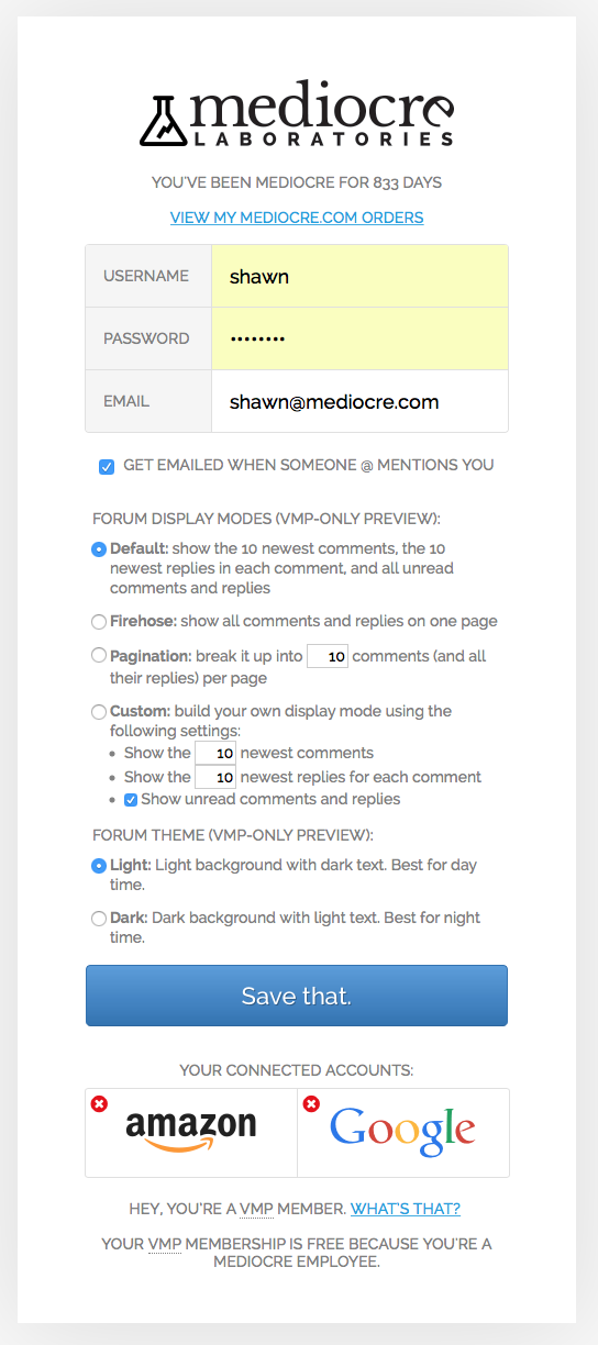 We're not happy with the name of this page, but haven't come up with something better yet. Other than that, the page is pretty straightforward. It allows you edit your username, password, and email address. You can also add/remove third-party connections (if you'd rather not remember another password and want to sign in using your Amazon or Google account).