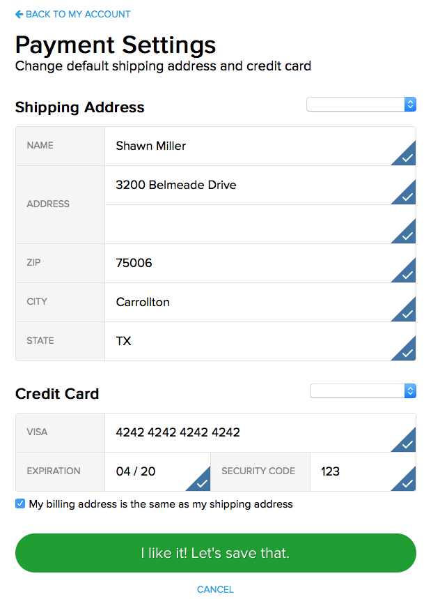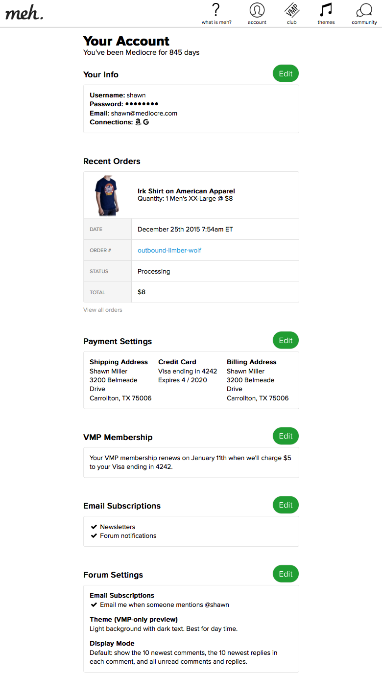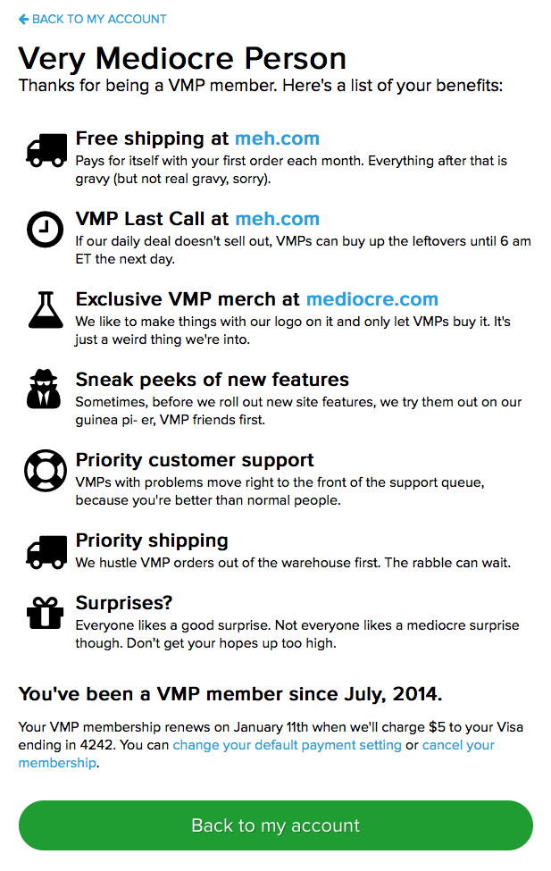 This is an important one. Before these new account pages were created your default payment setting when checking out on meh.com was always the last payment setting you used. If you're a VMP, your $5 payment every month was charged to the credit card you used when you signed up for your VMP membership.