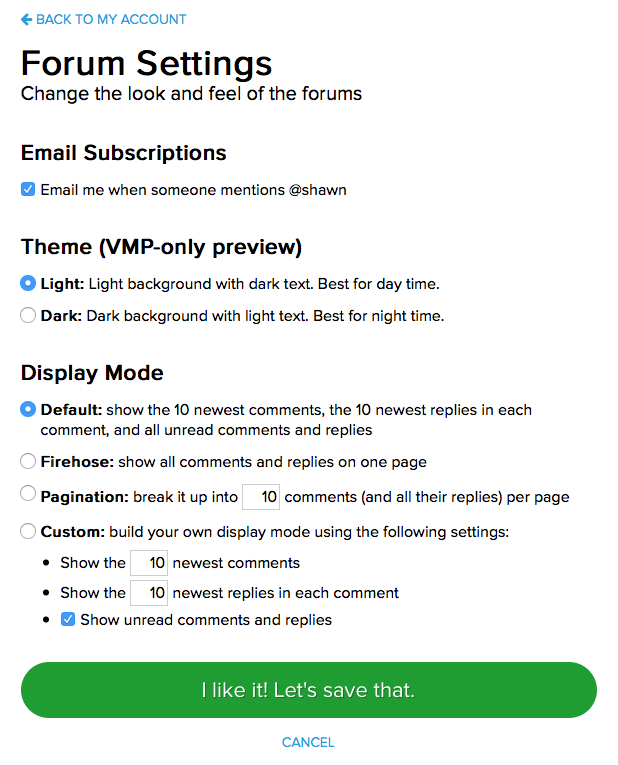 Hey, this means that 'display mode' settings have moved beyond VMP and into us peasants' setting pages as well! Well, not the night/day theme, but the firehose/pagination bit.