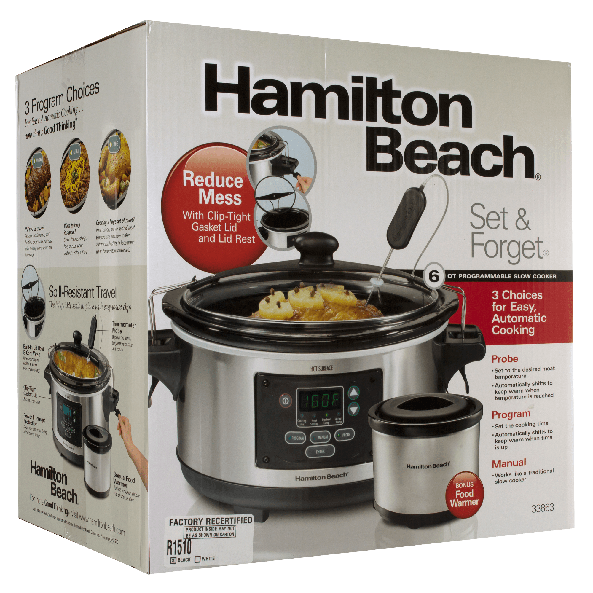 Specs ====- Model: 33863- Condition: Refurbished - Three cooking methods: program, probe and manual- Warmer is powered- Probe mode is for cooking large cuts of meat or for recipes that require food to reach a certain temperature - Thermometer probe reads the actual temperature of food as it cooks and displays it on the control panel - Lid securely seals in place for safe travel - Crock capacity: 6 quart removable stoneware (6 lb. chicken or a 4 lb. roast)- Warmer capacity: 16 oz- Power interrupt protection keeps slow cooker on during brief power outages (note: last time we sold a slow cooker with this feature, @Moose thought this was a weird feature to call out as he wrote the specs. Little did he know that his own slow cooker at home was turned off because of a brief power outage, and his dinner was ruined before it even started cooking)- User manualWhat’s in the Box? ====1x Slow cooker base 1x Stoneware crock 1x Lid 1x Warmer1x Warmer lid1x Probe 1x User manual Pictures====Cooker and warmerCookingTemp probeWarmerRoastChickenLid holder featureRetail boxPrice Comparison====$80 ListSlow cooker: $49 at AmazonWarmer: $12.99 at AmazonFind a relevant price comparison? Please share it in a comment in this thread