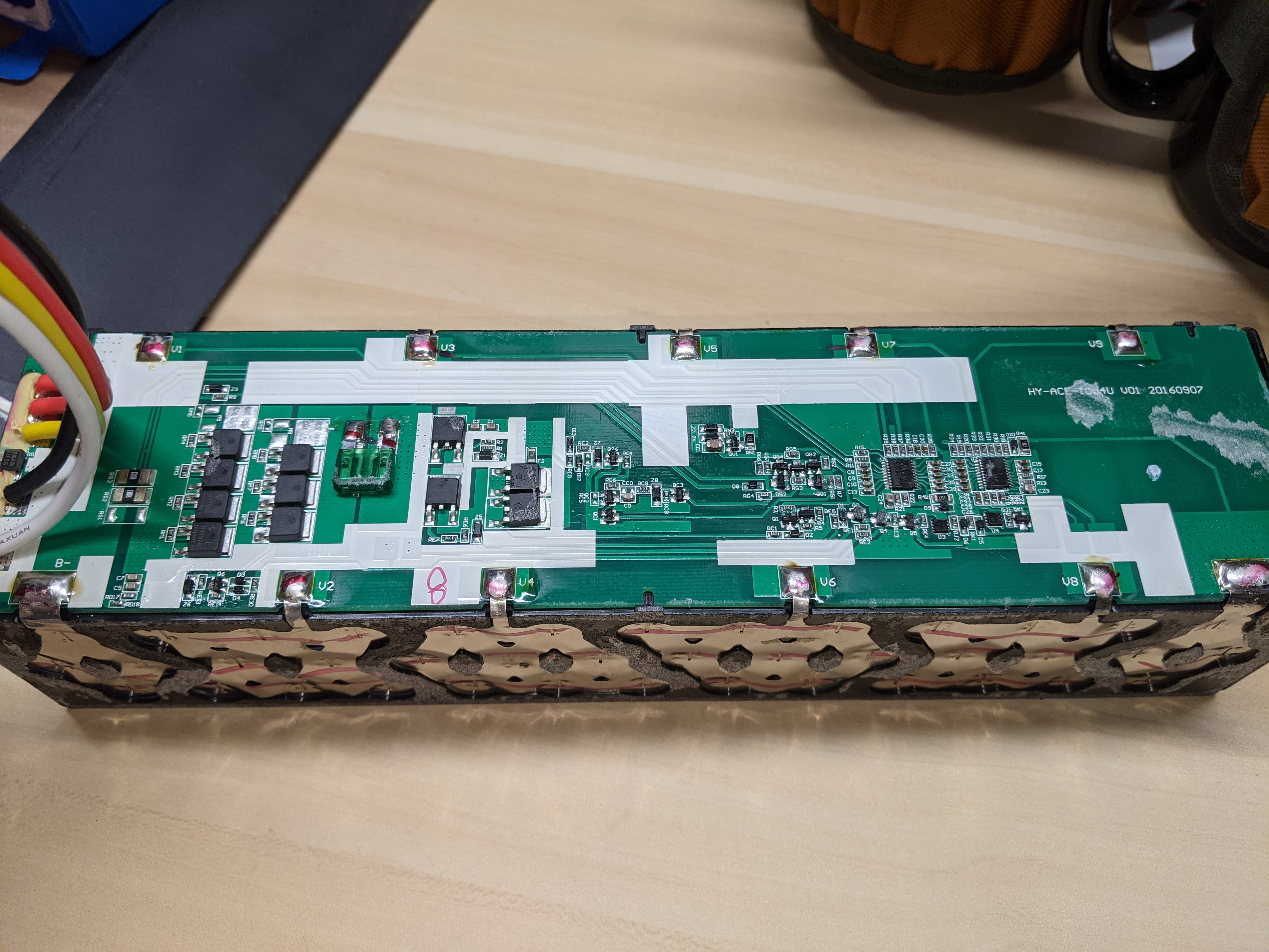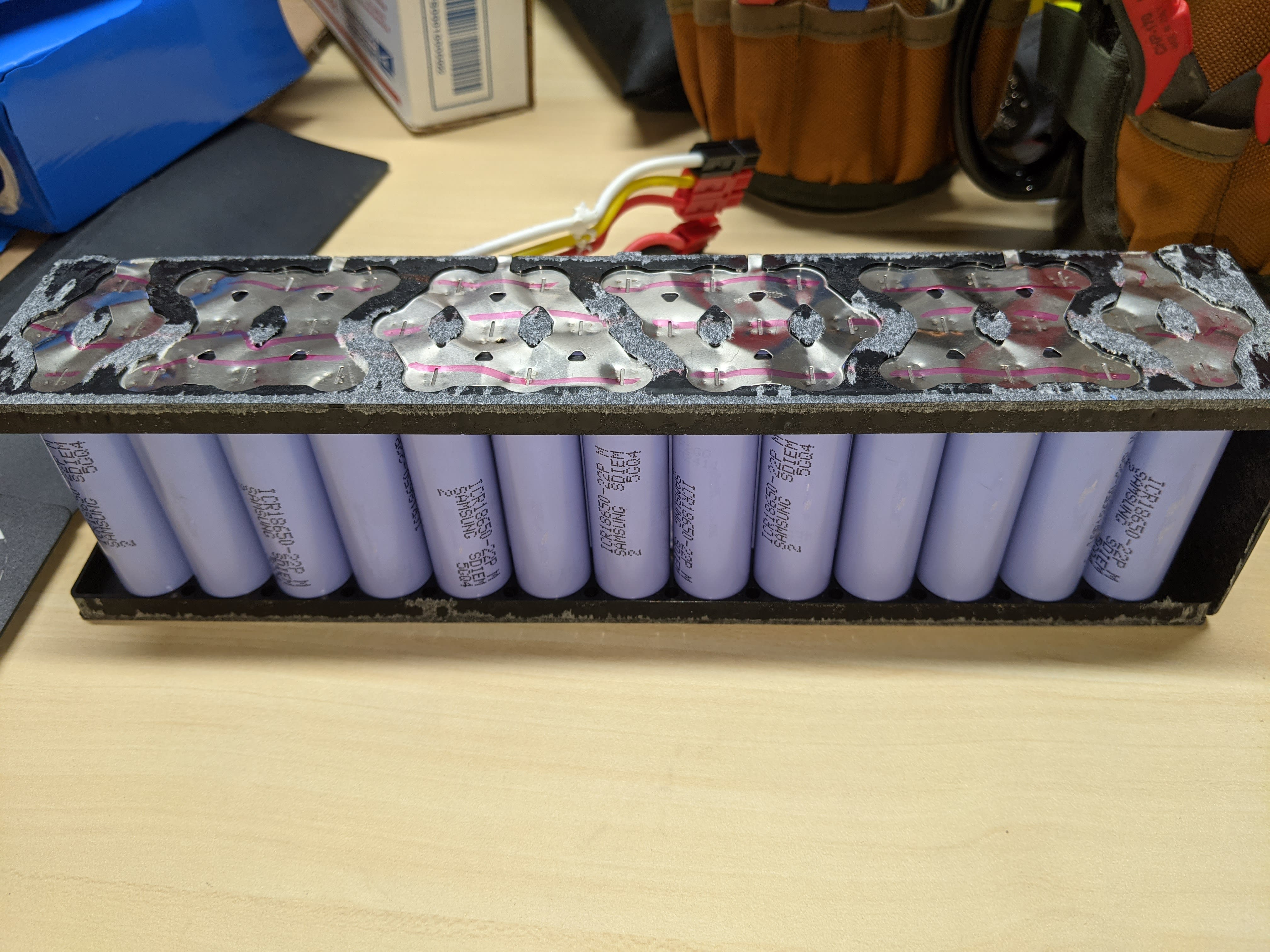 The battery is an array of 40 Samsung Li-Ion cells, arranged as 10 sets of 4 cells.