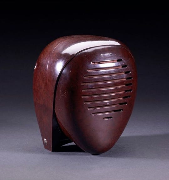 What we do know is that Zenith hired Noguchi to design the speaker for the Radio Nurse but not the ‘Guardian Ear’, the part you’d put in the baby’s room. So that latter component turned out as a nondescript, boxy little piece of Art Deco hardware. But the part Noguchi designed can’t be pinned down to any particular time. It could have been designed last week. Many have pointed out how it echoes classical Japanese kendo masks, but then if you wanted to make a Star Wars comparison, you wouldn’t be the first to do that, either.