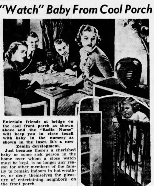 It wasn’t all sheer terror. Other ads went a little easier on the panic, pointing out how it could help you keep an ear out for your invalid Grandma, or inviting parents to relax and enjoy a game of bridge with the neighbors without worrying about your tots.