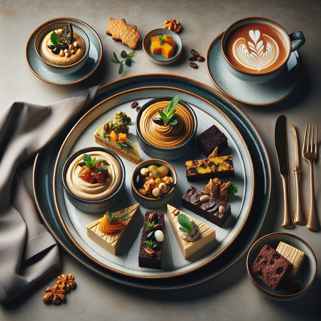 /showme An appetizer of Hummus Duo with Ginger-Pumpkin Biscotti, a main course of Savory Brownie Bites Medley, and a dessert of Caffeinated Chocolate Peanut Butter Energy Bar Cake
