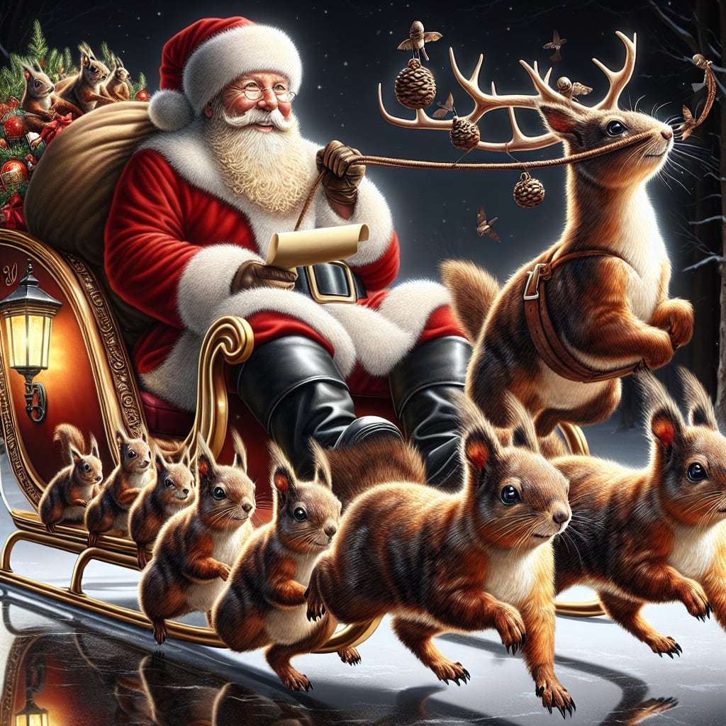 /showme photo realistic Santa in a sleigh pulled by squirrels instead of reindeer