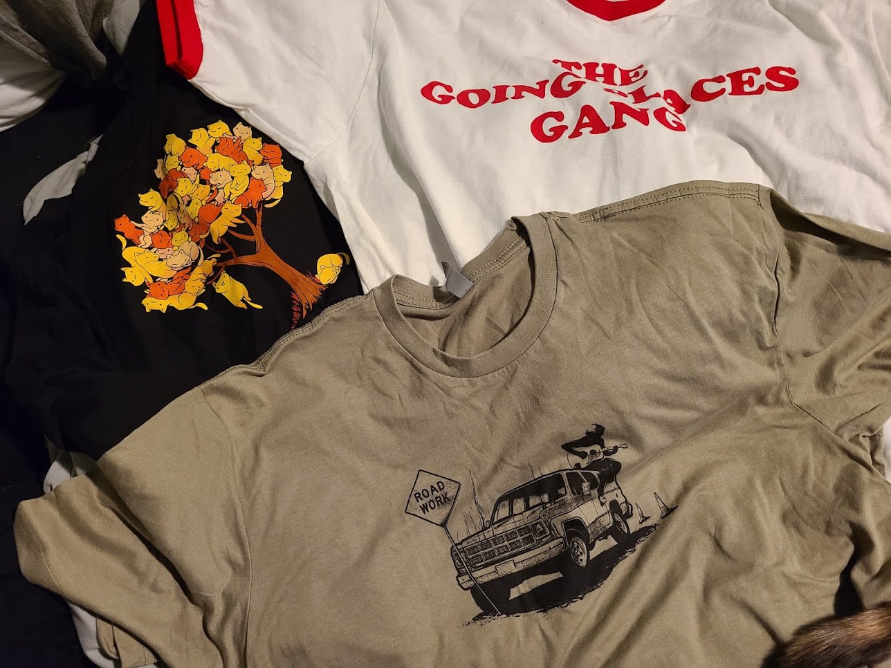 Got my 3 today. We’re these all on mediocritee at some point? I don’t recall most of them. I got the roadwork one others have posted, it’s in a dusty rose color. Then a black shirt that says Ragna-rok. And then this bright orange short (I mean it’s so bright it hurts my eyes) that says trillian astra on it and looks similar to a beer logo.