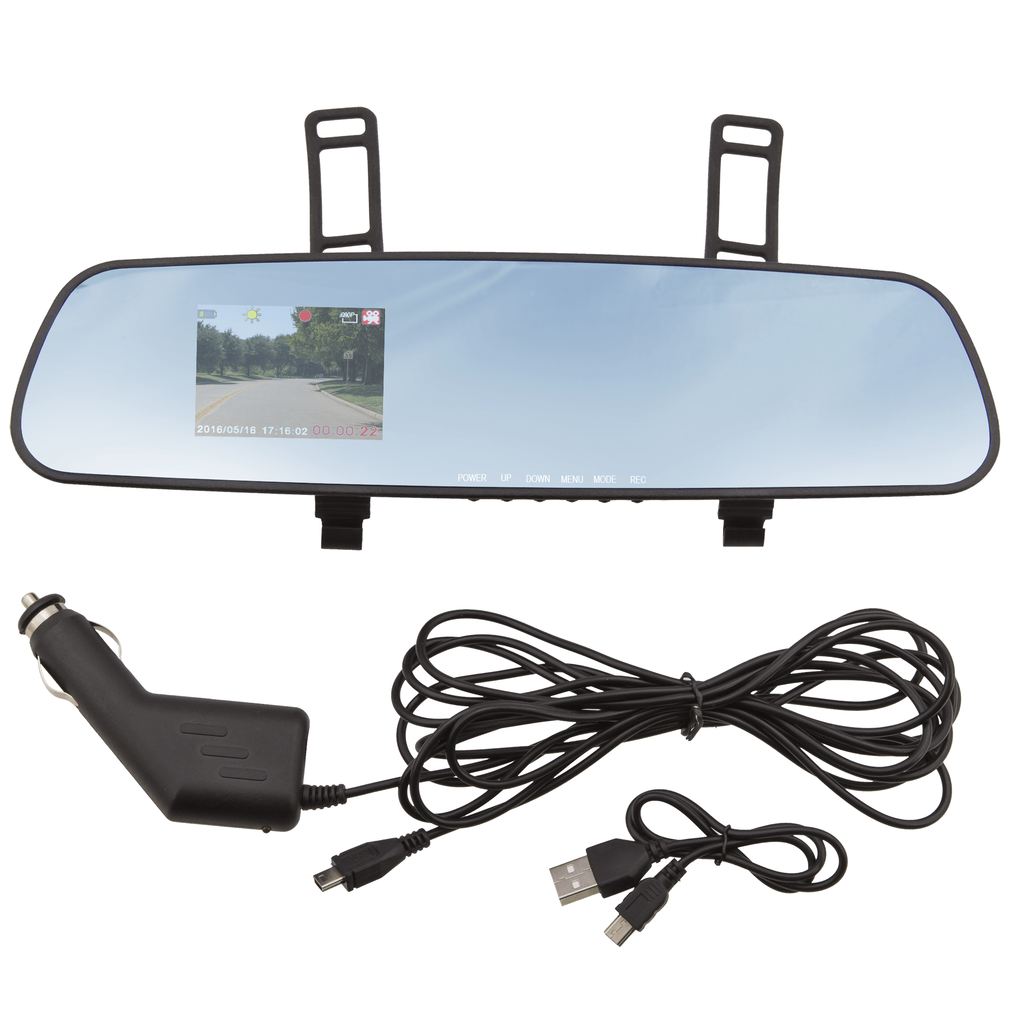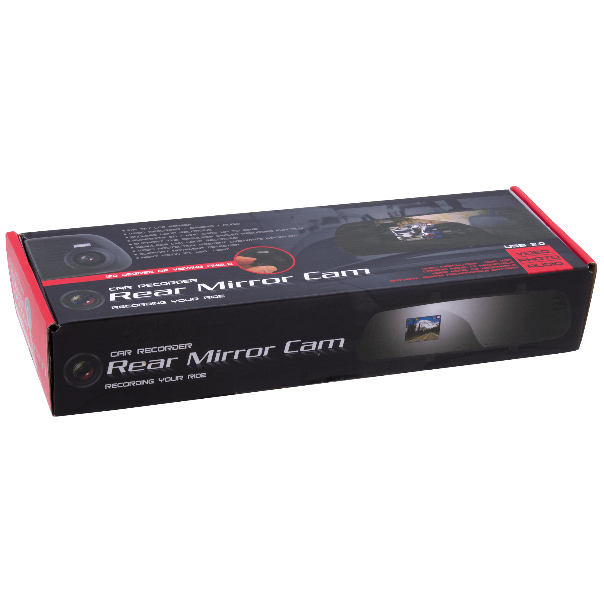 Specs ==== - Model: 02551 - Condition: New - Video resolution: 1280 x 720, 640 x 480 - Camera: 1.3 megapixels - Video format: AVI - Video saving cycle: 1/3/5 minutes - Micro SD: up to 32GB (not included) - Built-in microphone - Battery: 180mAh - Display: 2.7in LCD What’s in the Box? ==== 1x Mirror 1x Cigarette lighter charging cable 1x USB charging cable Pictures ==== Included Retail box Screen Driving Bottom view Back view