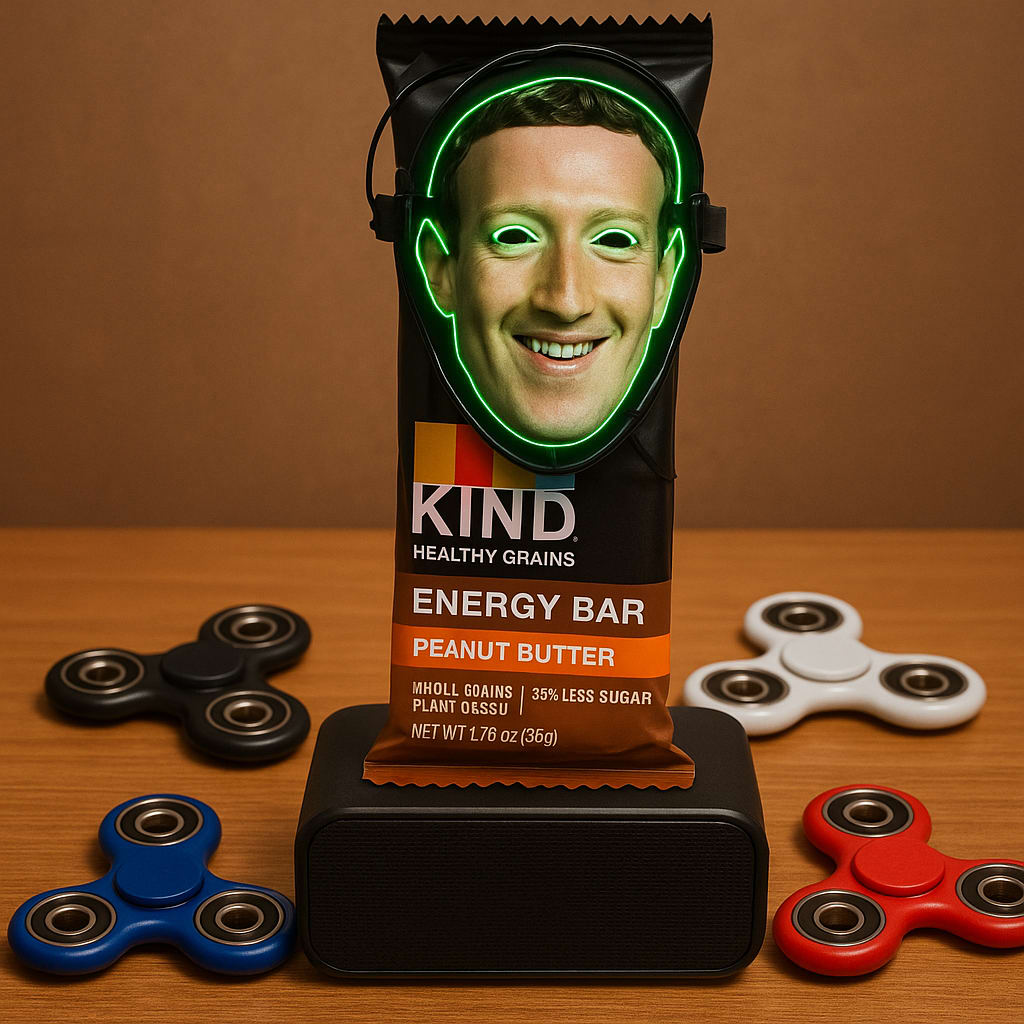 /showme Kind Healthy Grains Energy Bar wearing Rechargeable LED Halloween Mask with image of Mark Zuckerberg’s face standing on a speaker dock surrounded by fidget spinners