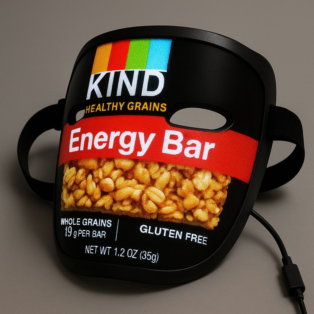 /showme Rechargeable LED Halloween Mask with image of Kind Healthy Grains Energy Bar.