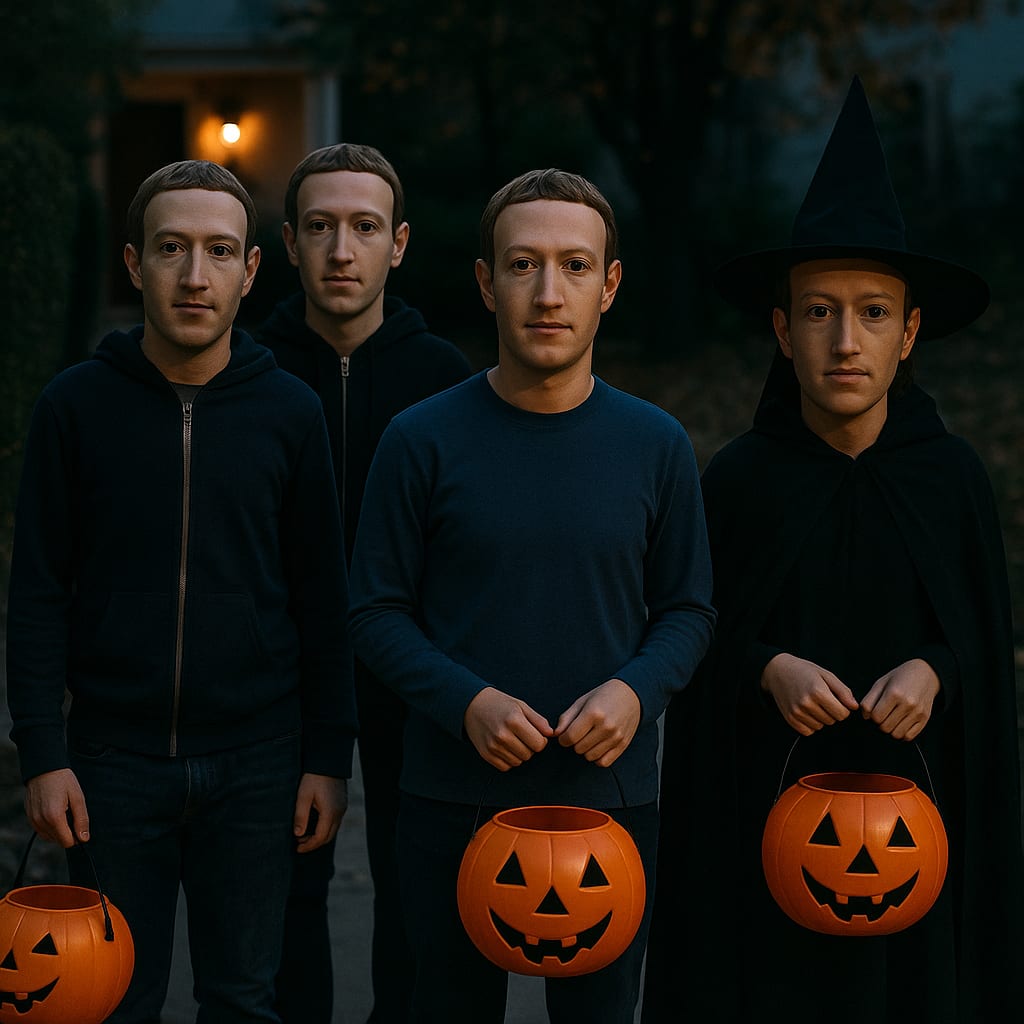 /showme Trick and treaters wearing Mark Zuckerberg masks.