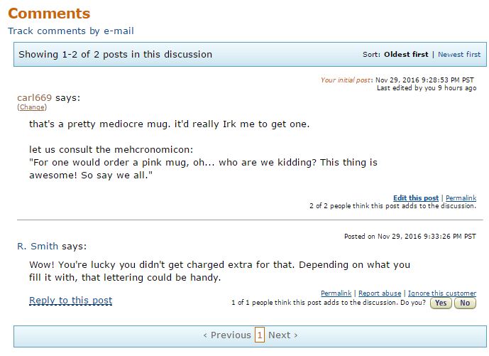 27I found this on Amazon and it made me laugh. Read the 1 star review. Somehow someone ordering a plain mug from Amazon ended up with a mug that had “meh” printed on it.