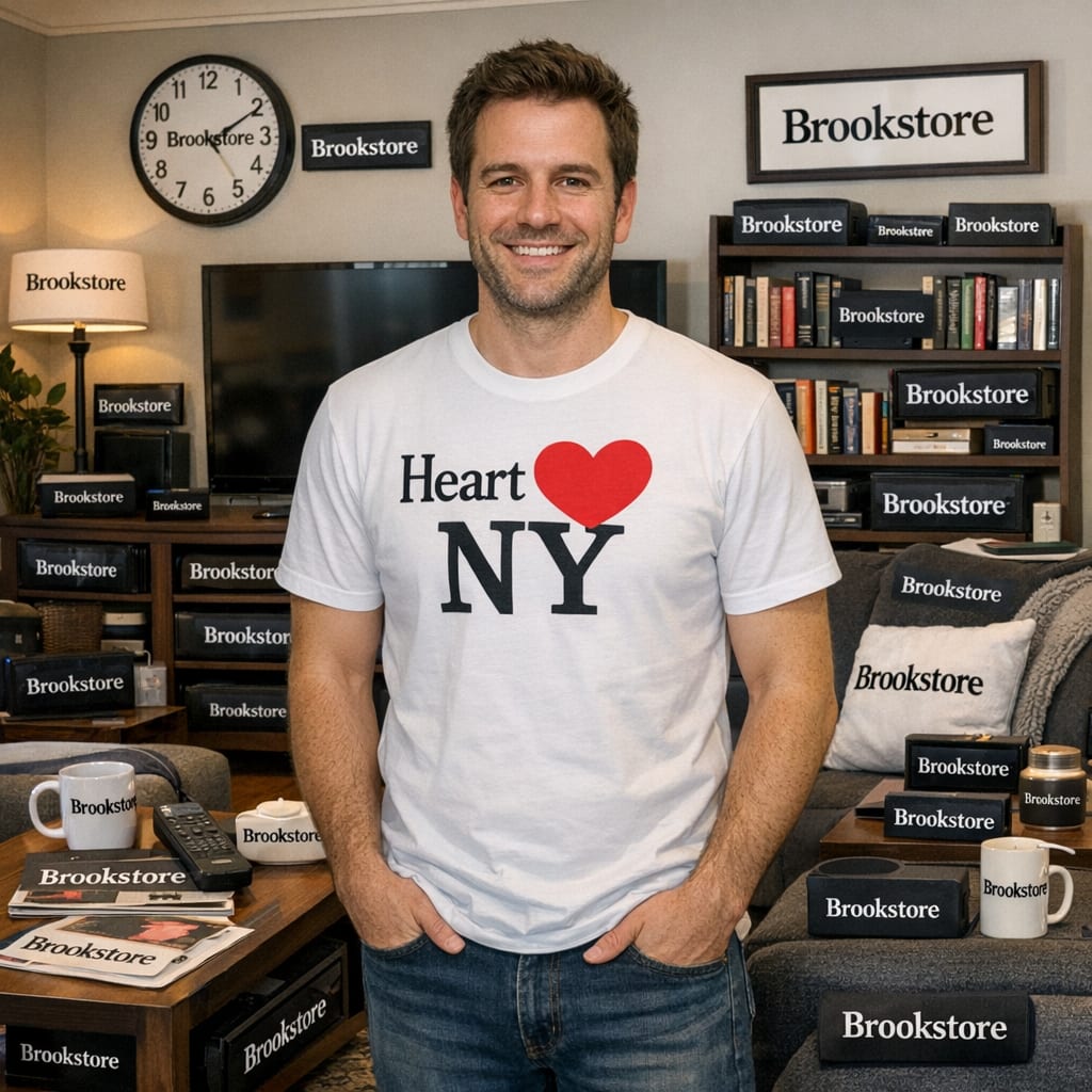 /showme human wearing shirt that says “Heart NY” is in living room where every object is labelled “Brookstore”.