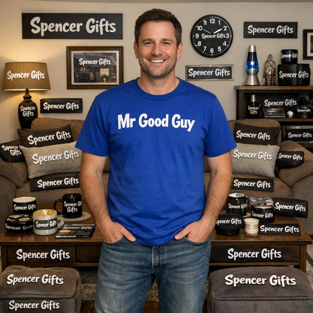/showme human wearing shirt that says “Mr Good Guy” is in living room where every object is labelled “Spencer Gifts”.