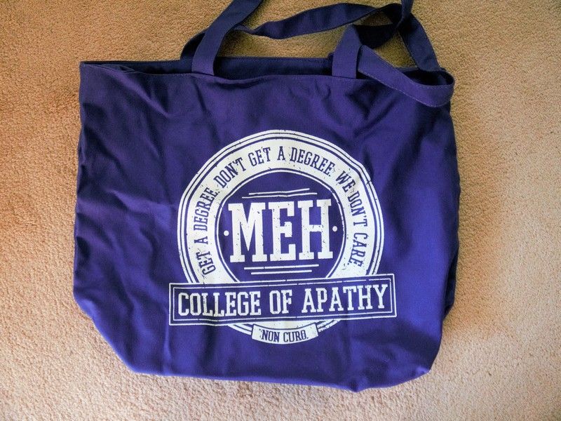 @rockblossom Those are the standard totes that are sold from time to time on shirt.woot. The design is @fishbiscuit’s College of Apathy.