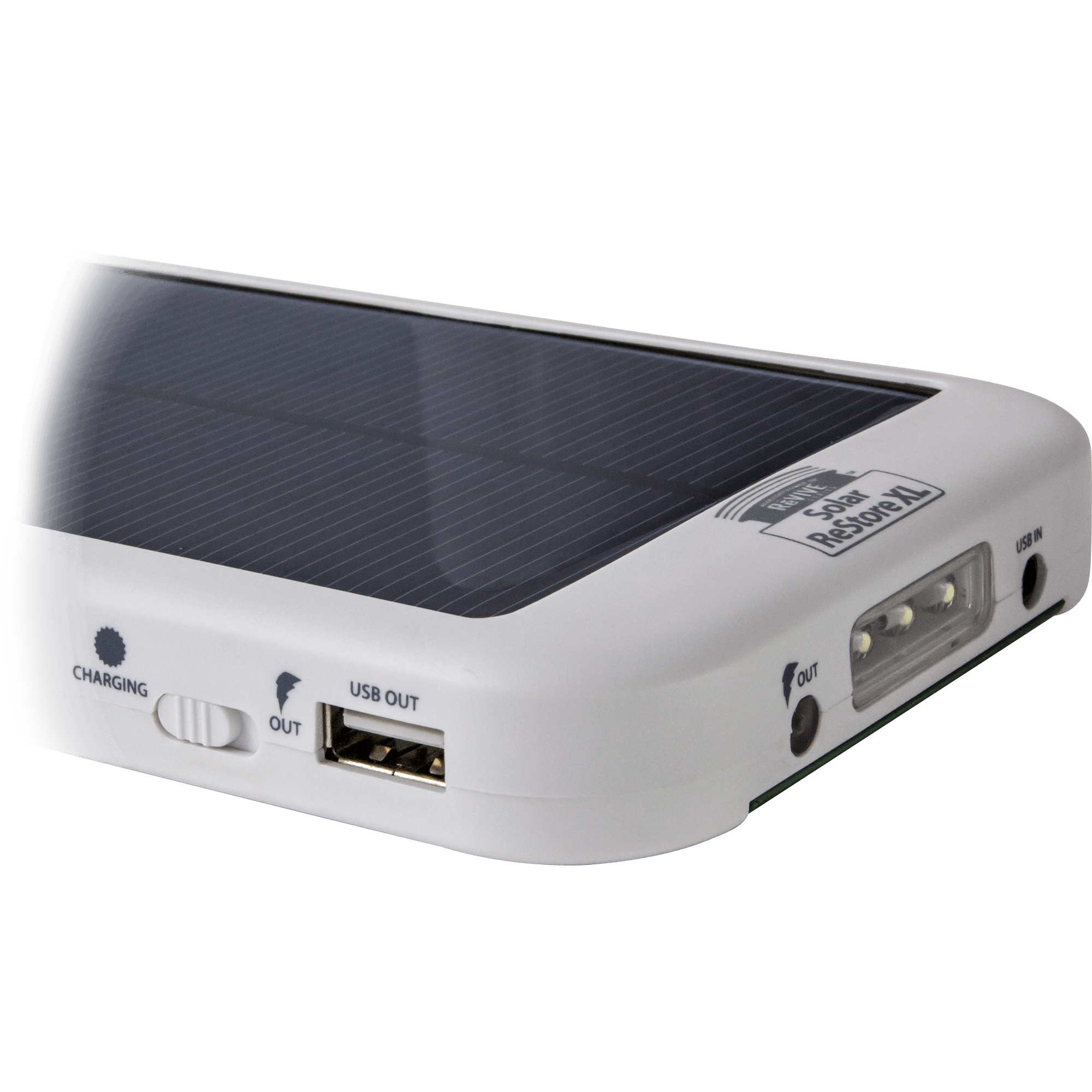 Specs ====- Model: CH-SOLRESTOREXL-WHT- 4,000mAh Li-Po battery- Output: 2.1A USB- Fully charge by direct sunlight in 13 hours (280mA)- Fully charge by USB in 4-6 hours- Capacity indicator and LED flashlight- Dimensions: 6.7 x 3.6 x .8 in- Weight: 8 ozCondition: NewWarranty:3 Year Accessory PowerEstimated Delivery: 5/6 - 5/8Shipping: $5 or free with VMP What’s in the Box?====1x Solar powered power bank2x Window suction cups1x Carabiner1x Solar panel extender for additional panels1x USB charging cablePictures ====Retail boxEverything includedCarabiner and top viewOutletsBack viewPrice Check====109.99 List, $29.99 at Amazon (sold third party)Find a relevant price comparison? Please share it in a reply to this comment