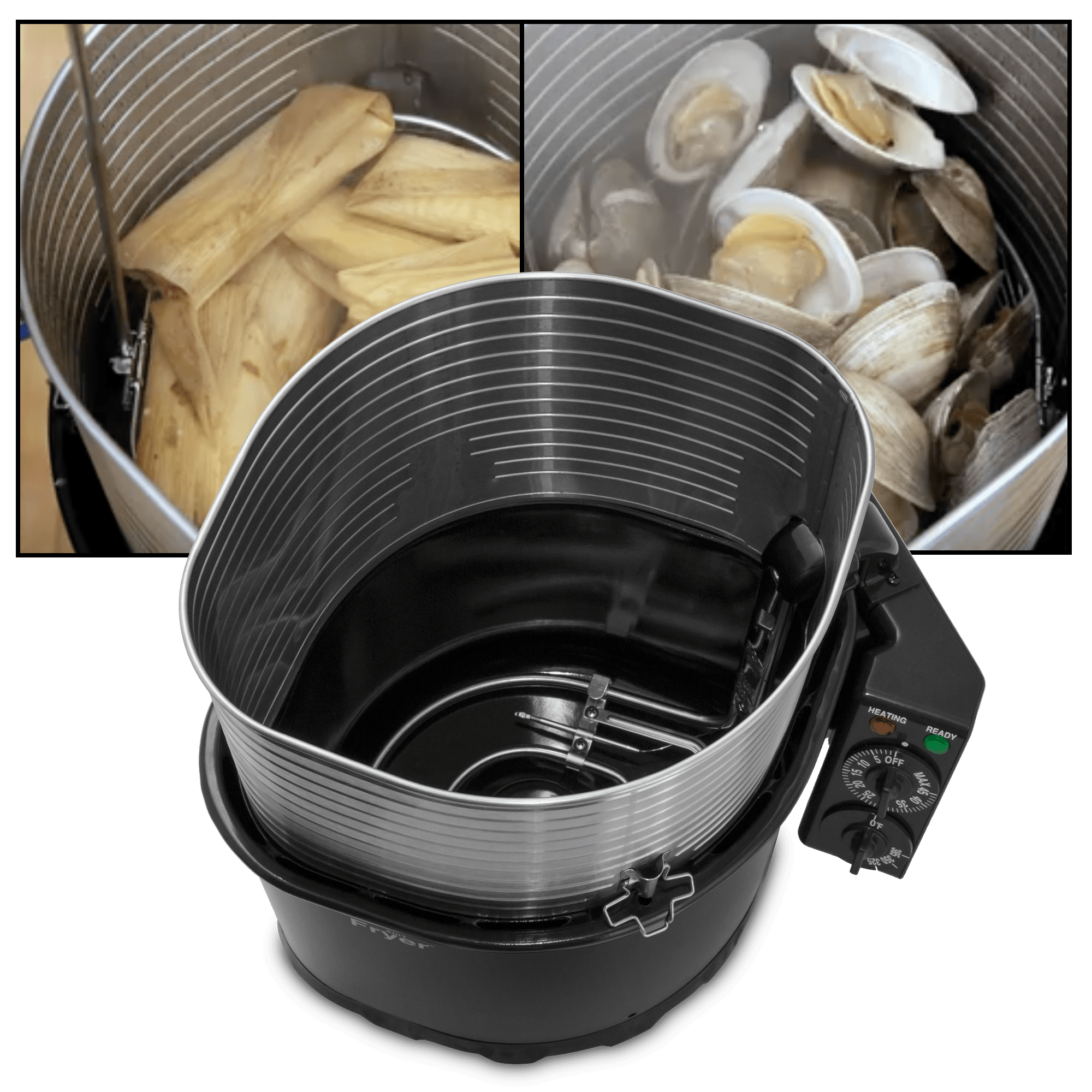 Specs ==== - Model: FS1735-M - Condition: New - Oil capacity: 3 - 5 quarts - Heats up in 13 - 19 minutes - Dishwasher safe (except for electrical control box/heating element) - Fry, steam, boil, cook rice and steam bake - Includes 3 high-density oil cleaning filters and a funnel to reuse oil What’s in the Box? ==== 1x Fryer 1x Safety extension sleeve 1x Carving stand 1x Basket with handles 2x Lids 1x Hands free funnel 3x Charcoal filter pads 1x Safety gloves 1x Donut cutter 1x Turkey carving knife 6x Muffin baking containers 1x Bread/cake baking container 1x Steam-blocking sheet 1x Instructional DVD 1x Instruction booklet with recipes 1x Marinade booklet Pictures ==== Fryer Everything TurkeyLaid out Top view Cross section Hot dogs too, why not Rice Price Comparison ==== $210.65 at AmazonFind a relevant price comparison? Please share it in a comment in this thread