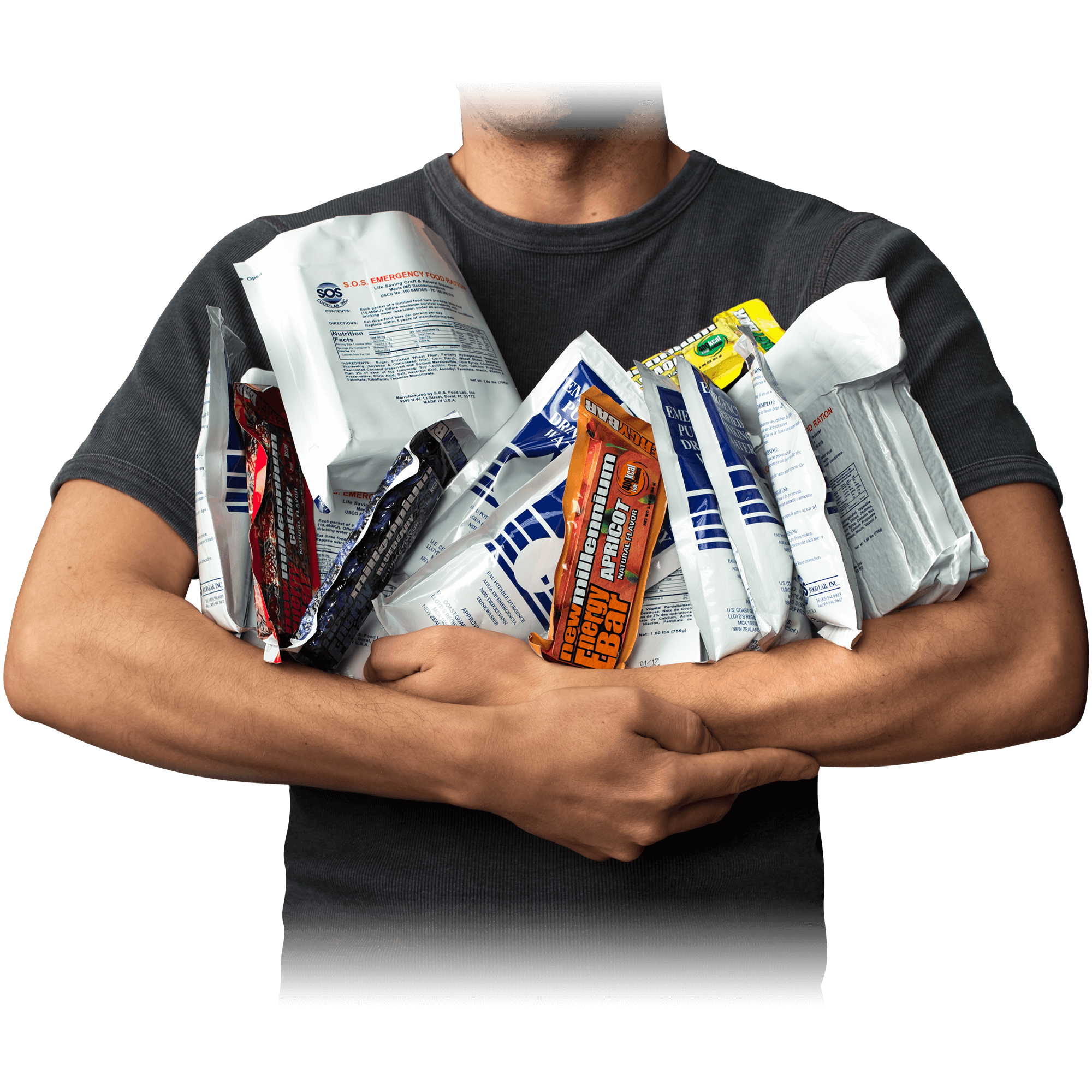 Specs ====- Model: ?- Condition: New- Eat 3 food bars per person per day- Calories per cookie: 400-410- Total fat: 18g- Sodium: 15mg- Cholesterol: 0mg- Total Carbohydrate: 53g- Protein: 8g- Drink 2 bags of water per person per day- Contents per bag: 4.227 Fl. oz- Expires in the year 2021 What’s in the Box? ====4x packs of 9 emergency food rations (36 total)1x Lemon-flavored food ration1x Cherry-flavored food ration1x Apricot-flavored food ration1x Blueberry-flavored food ration8x Water packetsPictures====Arms fullEverything includedThe flavored onesThe waterThe rationsThe rations againPrice Comparison====$49.99 at Amazon