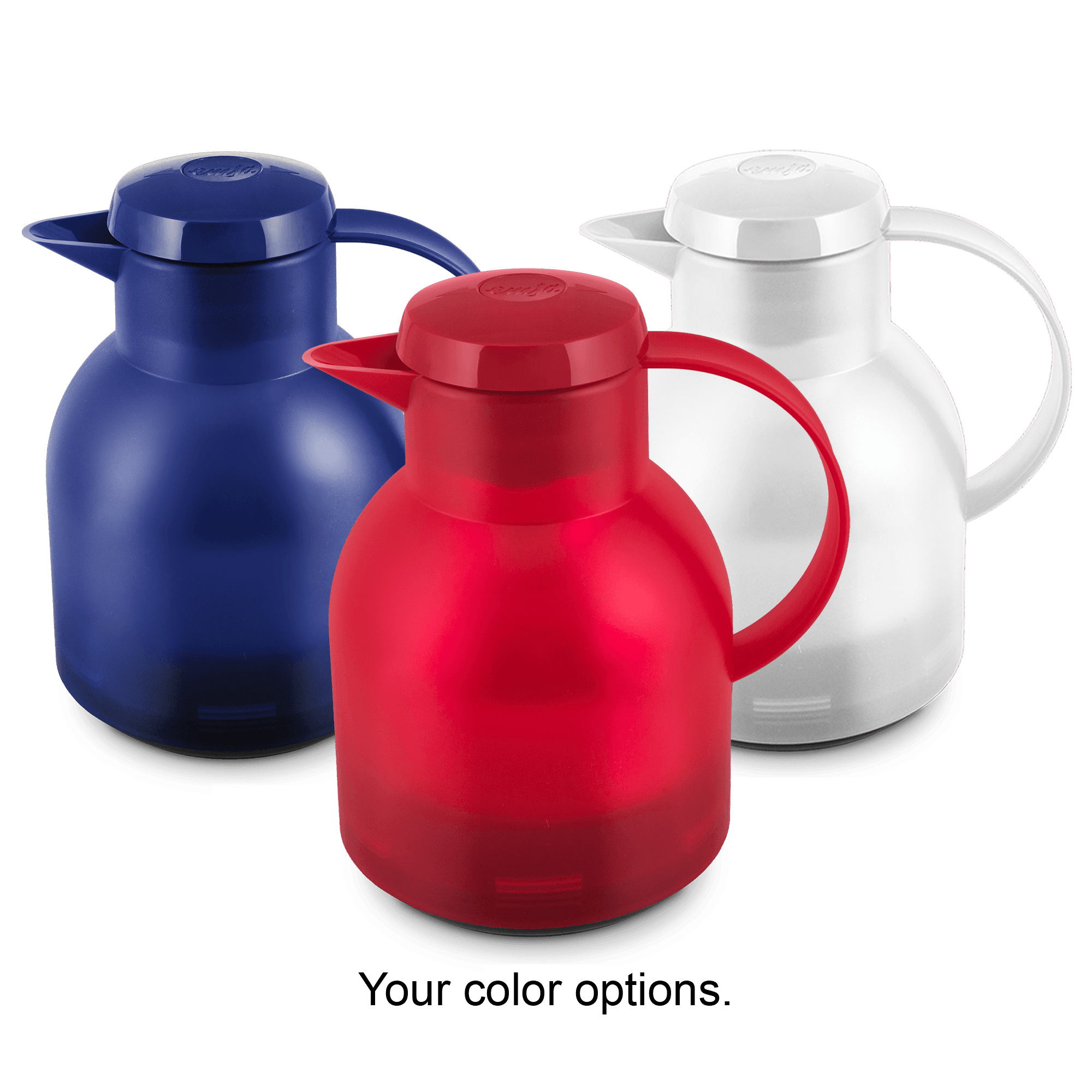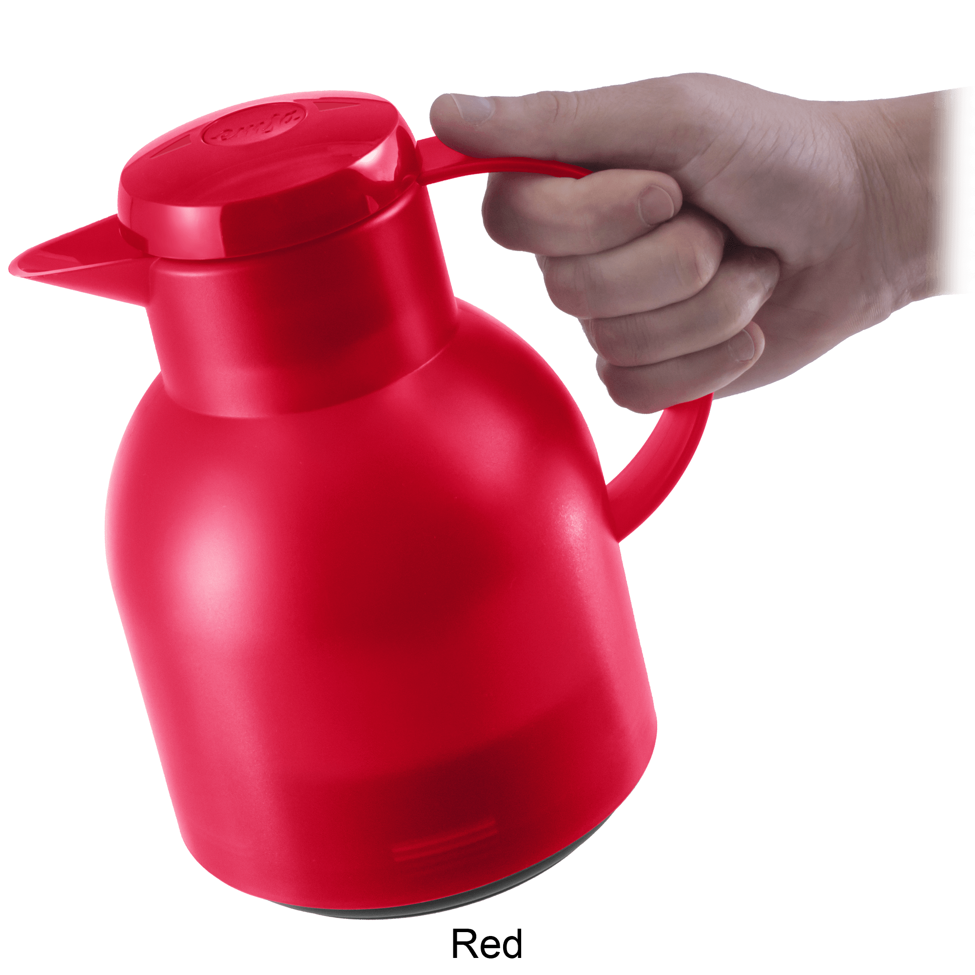 Specs ====- Model: E504235 - Capacity: 34 fl. oz (1 liter) - BPA free - High impact plastic exterior with glass vacuum sealed liner - Bottom screws off to clean glass liner - 100% Leak proof - Opens with button on lid - Heat and cold retention up to 16 hours - Dimensions: 8.5" x 6.5" (Height x Diameter) Condition: New Warranty: 90 day Mediocre Estimated Delivery: 7/13 - 7/18Shipping: $5 or free with VMP What’s in the Box? ====1x Samba Carafe 1x Lid Pictures ====OptionsRedWhiteBlueInside redLidPush-buttonRed in handGlass insidePrice Comparison ====$25 List, $20.00 - $23.85 at Amazon (243 reviews)Find a relevant price comparison? Please share it in a comment in this thread