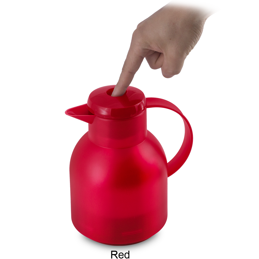 Specs ====- Model: E504235 - Capacity: 34 fl. oz (1 liter) - BPA free - High impact plastic exterior with glass vacuum sealed liner - Bottom screws off to clean glass liner - 100% Leak proof - Opens with button on lid - Heat and cold retention up to 16 hours - Dimensions: 8.5" x 6.5" (Height x Diameter) Condition: New Warranty:90 day MediocreEstimated Delivery: 7/13 - 7/18Shipping: $5 or free with VMP What’s in the Box? ====1x Samba Carafe 1x Lid Pictures ====OptionsRedWhiteBlueInside redLidPush-buttonRed in handGlass insidePrice Comparison ====$25 List, $20.00 - $23.85 at Amazon (243 reviews)Find a relevant price comparison? Please share it in a comment in this thread