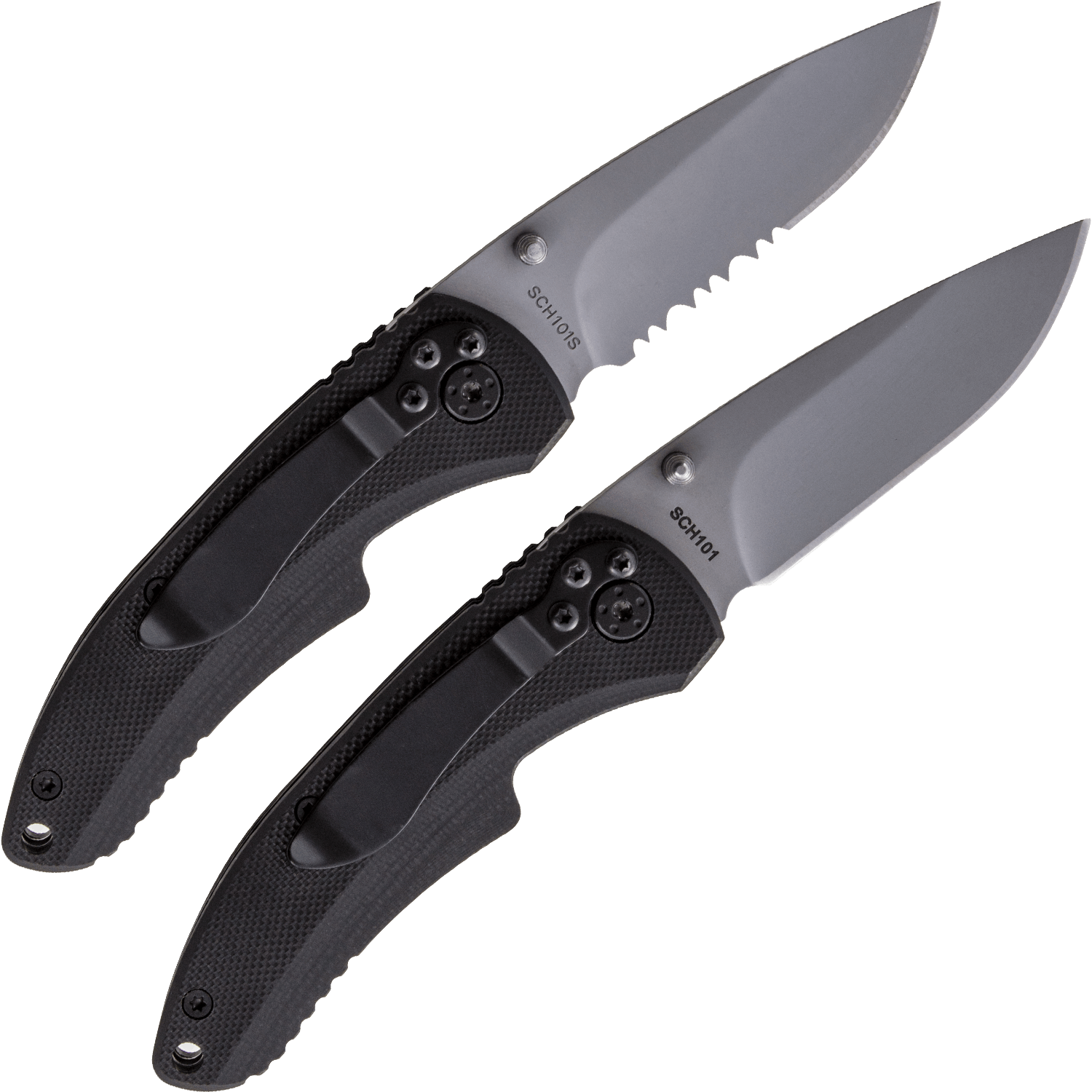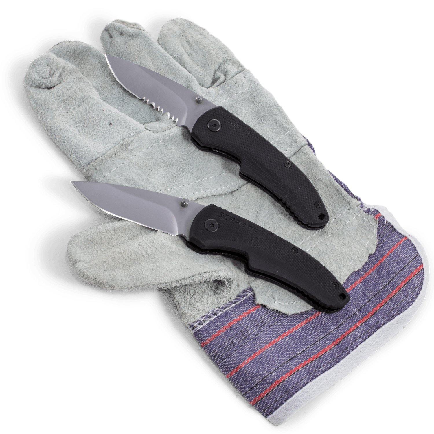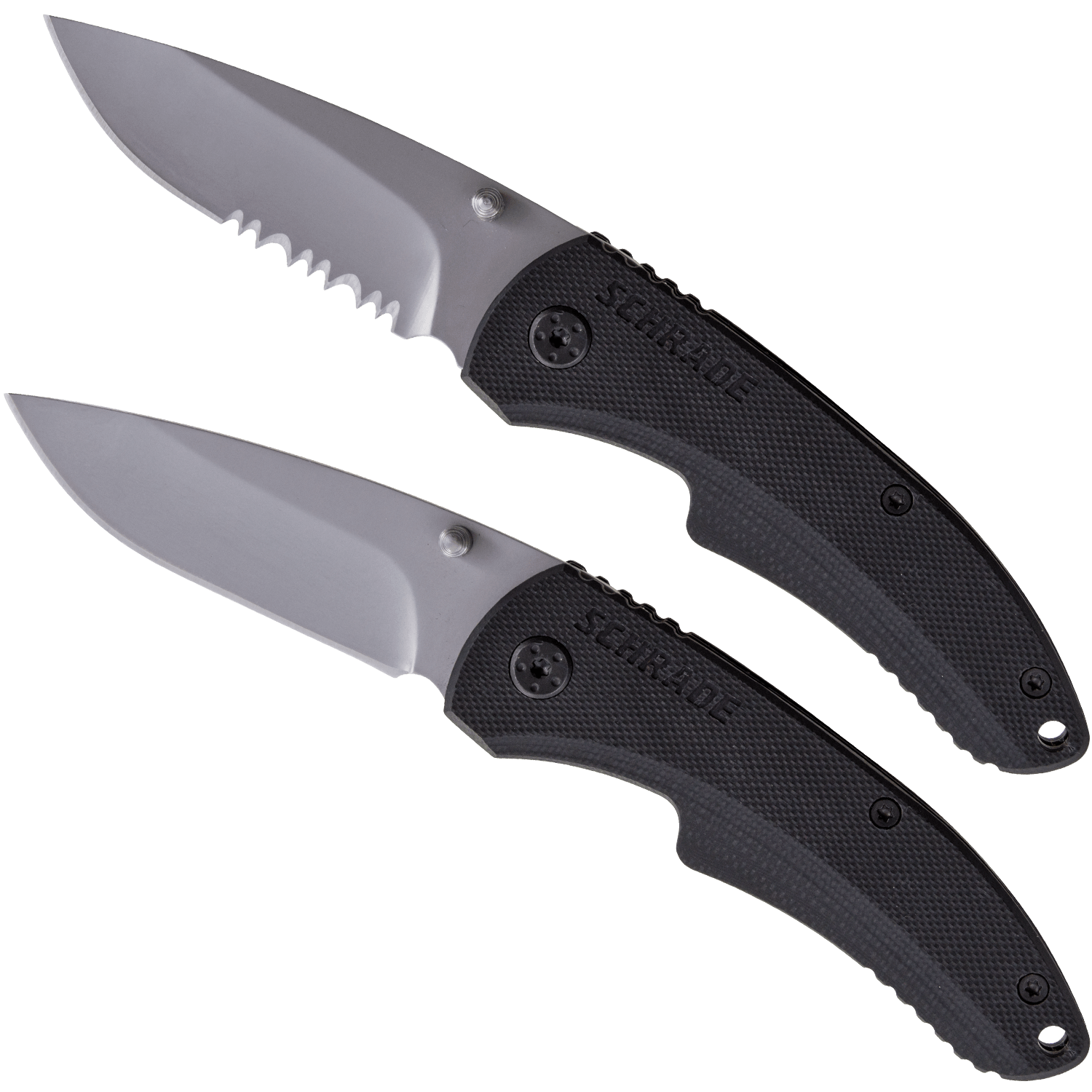 Specs ==== - Model: SCH101- Model: SCH101S - 9Cr14Mov Stainless Steel - Drop Point Blade - G-10 Handle - Bead-blast coating - Blade length: 2.6 in - Opened length: 6.25 in - Closed length: 3.5 in - Liner lock - Ambidextrous thumb knobs Condition: NewWarranty: Lifetime SchradeEstimated Delivery: 4/27 - 4/30Shipping: $5 or free with VMP What’s in the Box? ==== 1x 2.6in Schrade serrated drop-point knife 1x 2.6in Schrade non-serrated drop-point knife Pictures ==== Open knivesReverse openClosed knivesReverse closedGlove for scaleGlove post knife game for scalePrice Check ==== $42.64 List, $23.68 at Amazon for non-serrated and serrated (third party) togetherFind a relevant price comparison? Please share it in a reply to this comment