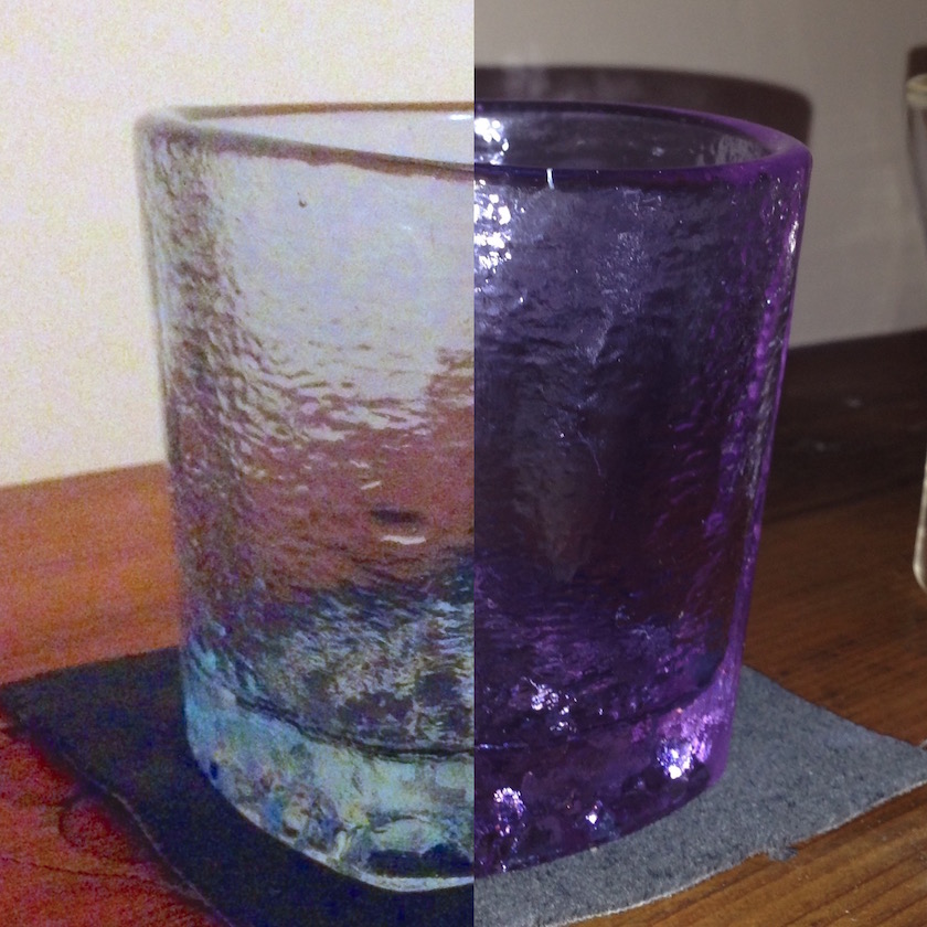 @KDemo It really is, the pictures don’t do it justice. It’s also all recycled glass, it’s sturdy, and their customer support is amazing. They actually started up shop back in the day because of a lack of glass recycling facilities in the area. Also, the lavender is alexandrite, so this happens when you move into fluorescent light: