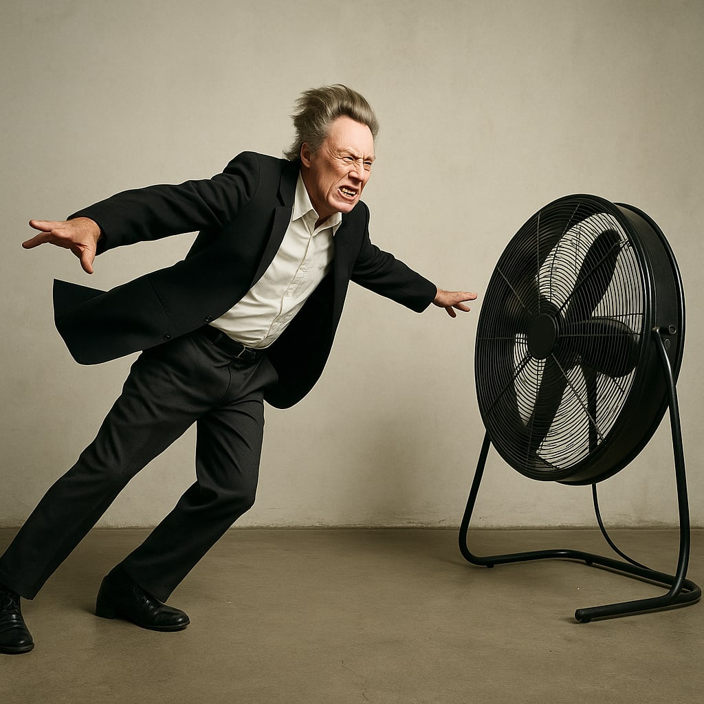 /showme a Christopher Walken being blown horizonally by a giant fan