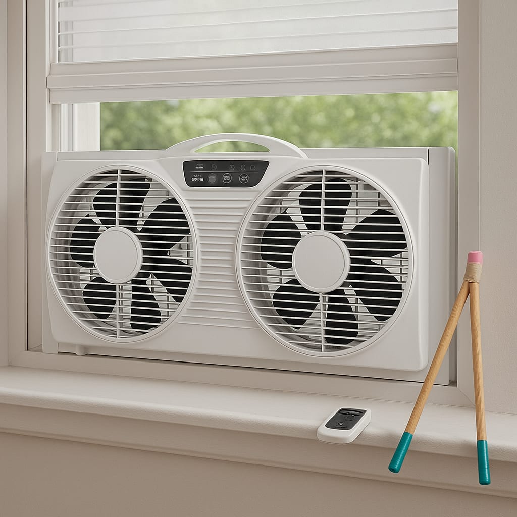 /showme a window fan with a remote control made from three broom handles and a pencil eraser taped together.