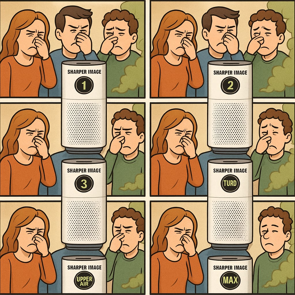 /showme a Sharper Image PURIFY 9 Air Purifier cycling through 6 modes to clear the air after someone with flatulence stinks up the room causing everyone else to plug their noses.