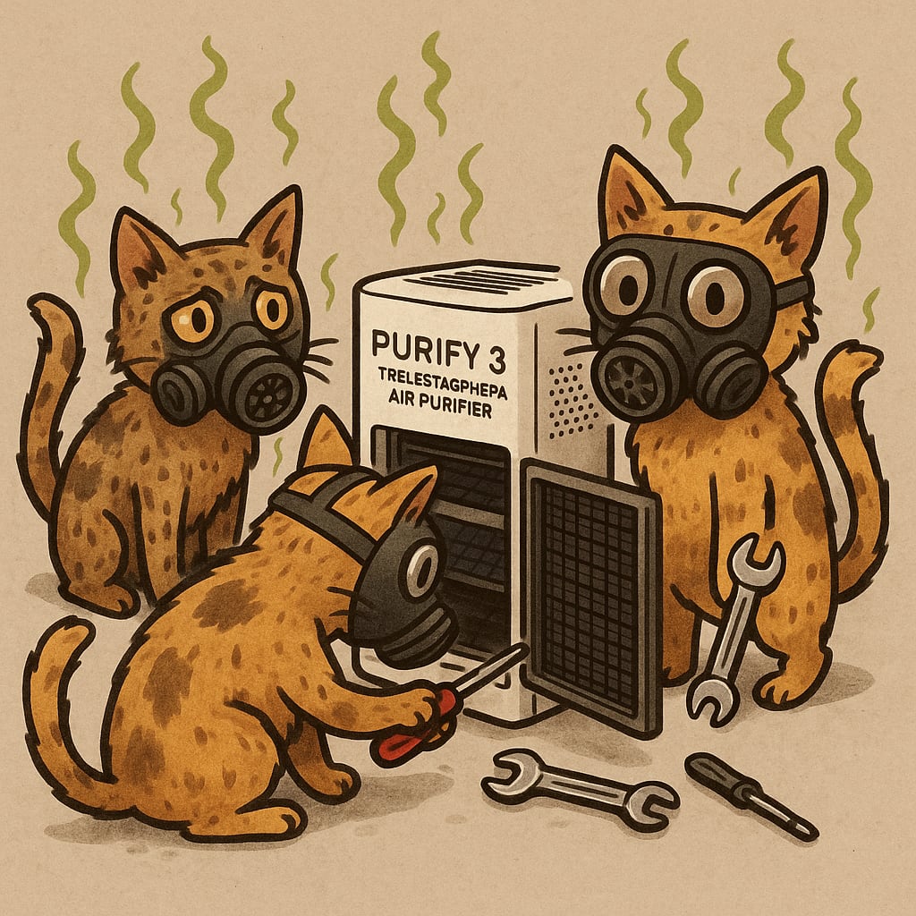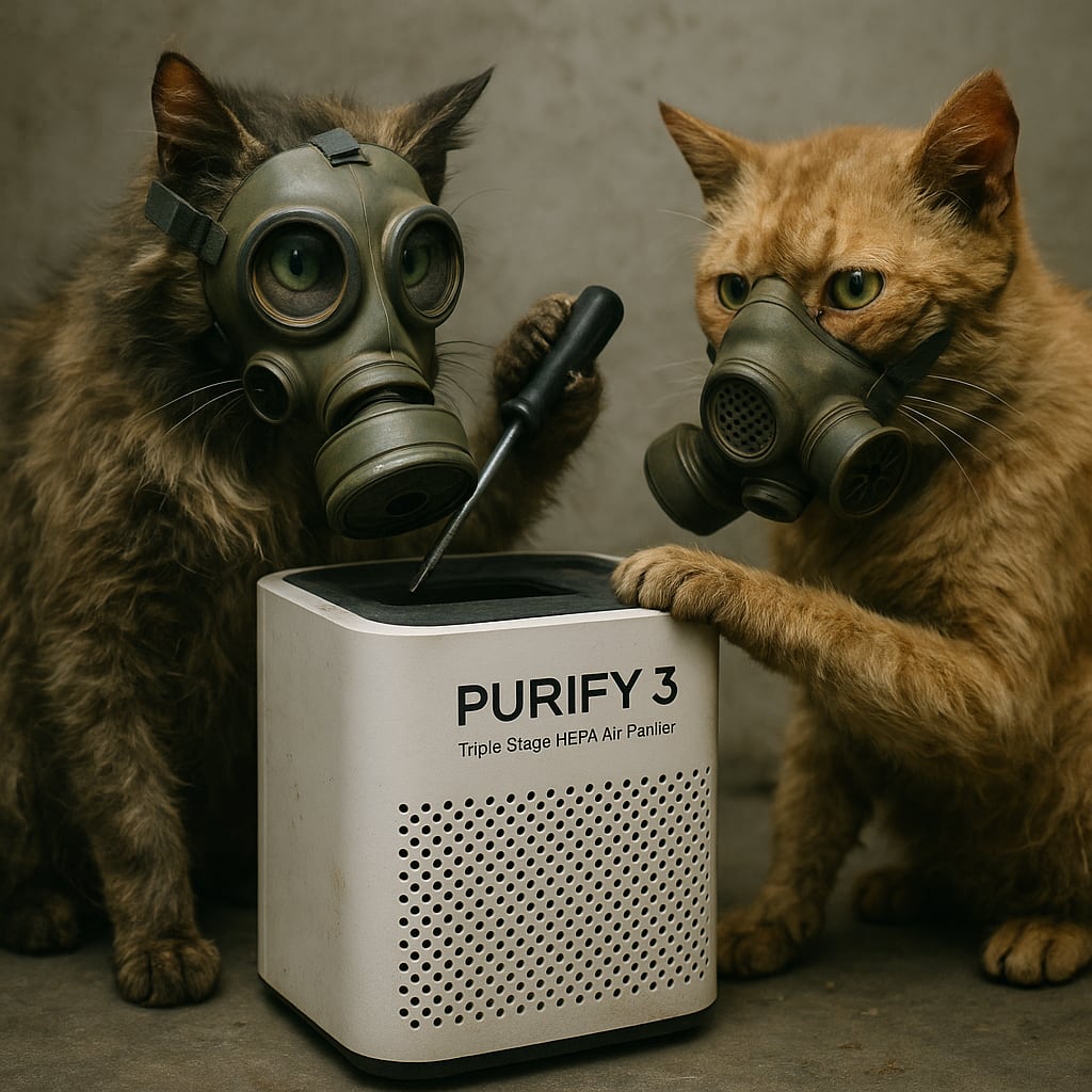 /showme smelly cats wearing gas masks are trying to repair PURIFY 3 Triple Stage HEPA Air Purifier