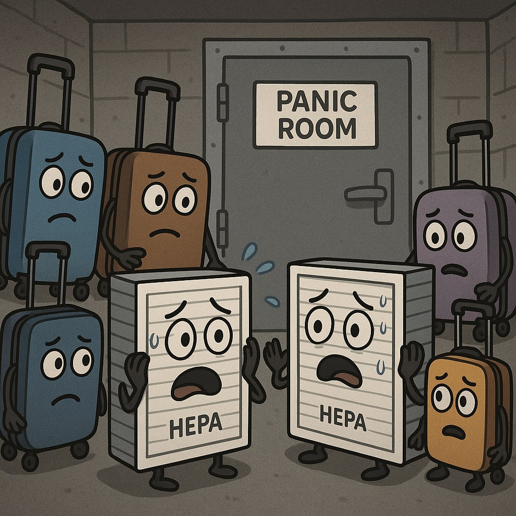 /showme pack of anthropomorphized rolling luggage surrounding two anthropomorphized hepa air filters in panic room.