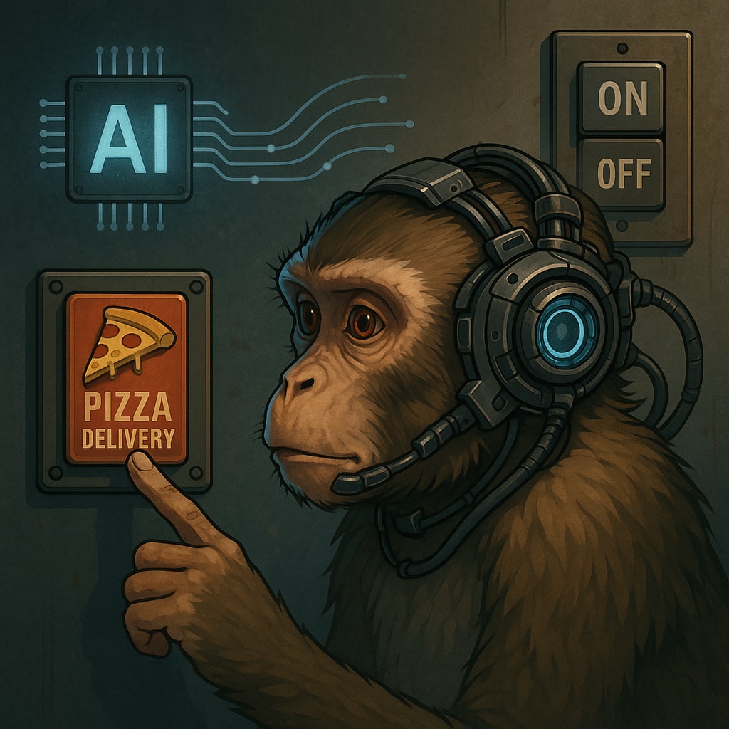 /showme AI transmitting commands to monkey wearing cyber headset to replace on/off switch with pizza delivery button.