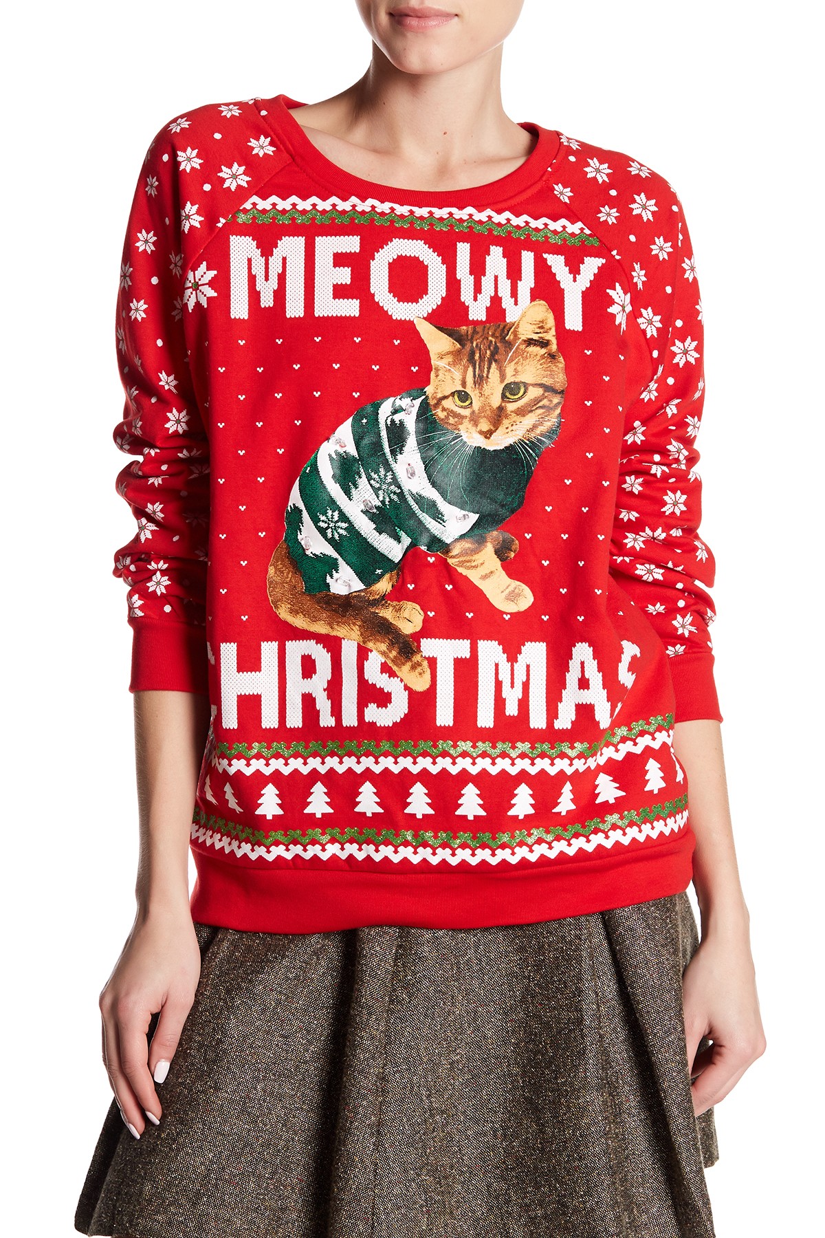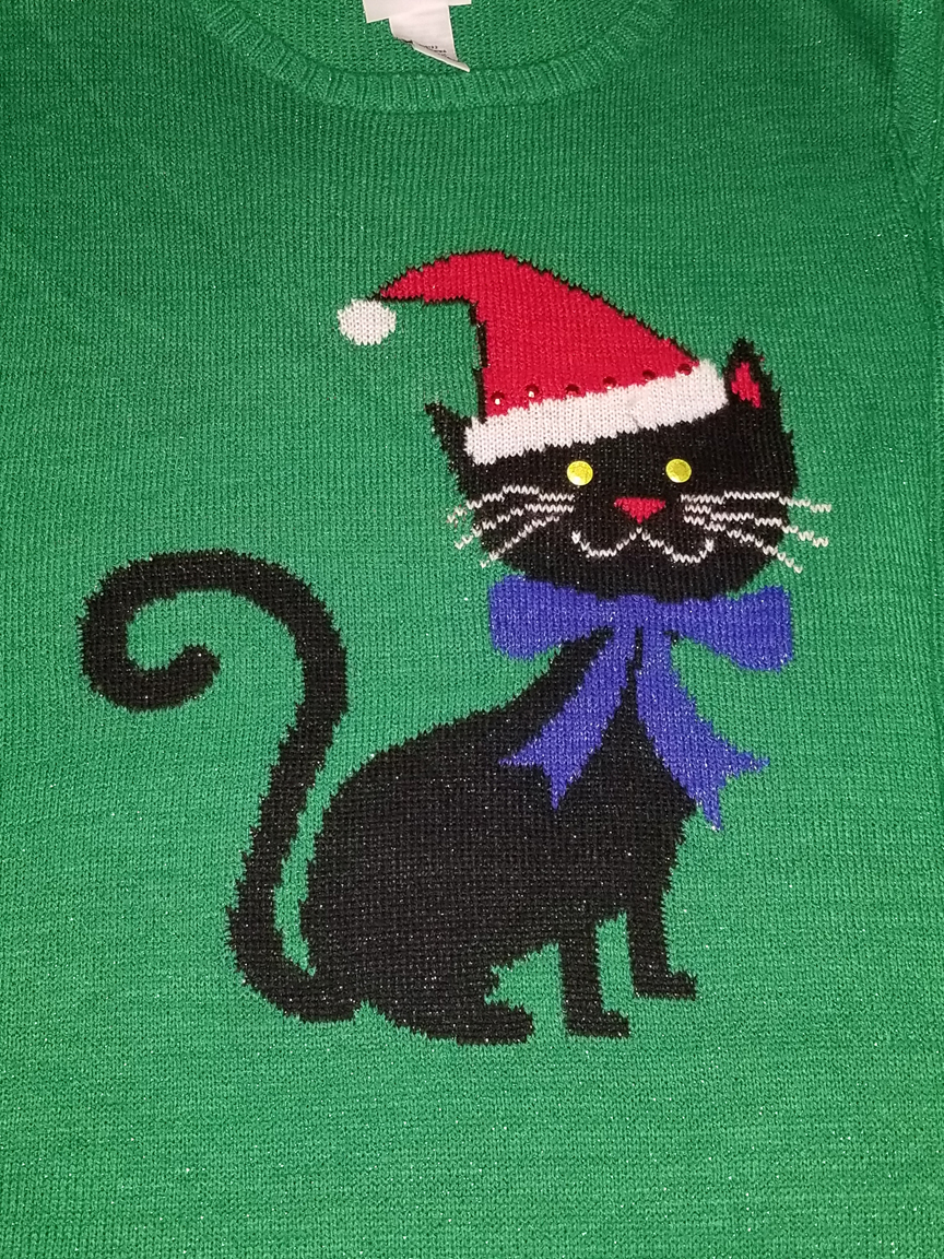 This is the sweater I wore last year for the first and only annual ugly Christmas sweater contest at work. While it may not appear ugly here, I stapled bows, holiday lights, holly and other holiday-related crap to the sweater to enhance the beauty of the cat. Oddly enough, I won first prize – a $50 Visa gift card.