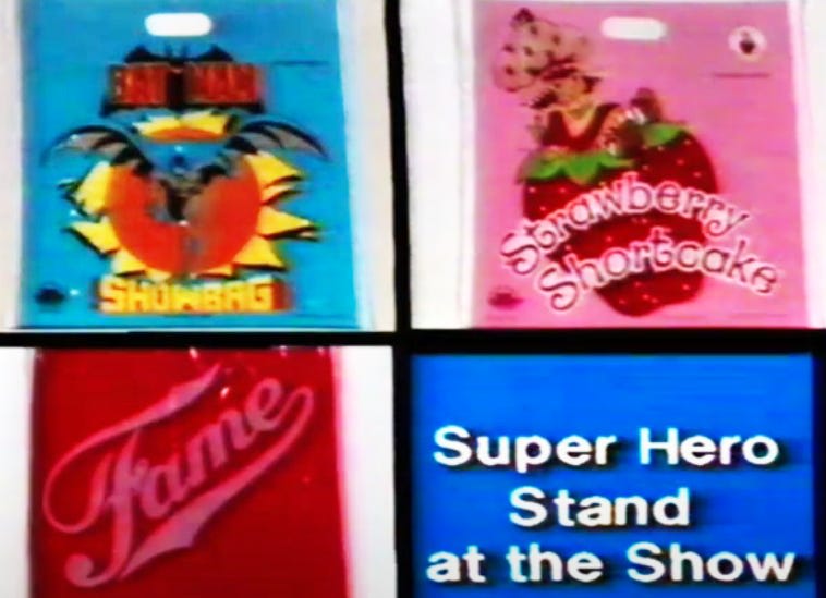 What else was cheap that kids liked? Comic books. So the first licensed-IP showbags featured superheroes like Spider-Man and Batman. That’s also about when showbags moved out of the “Hall of Industry” into their own pavilions, losing any pretense of being mere bags of samples and becoming purpose-built products in their own right.