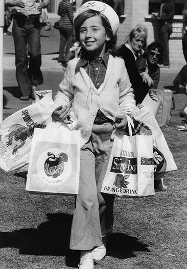 Showbag commercialism really exploded in the '70s and '80s. With showbags featuring every TV show, sports team, pop group, media outlet, junk food brand, and much more besides, newspapers started printing pull-out guides to the bags at each year’s show. Kids pored over the details before their family’s trip to the show, meticulously weighing how to make the most of the showbag budget laid down by their parents, who encouraged this advance shopping to minimize time in the fevered Dantean maelstrom of the showbag pavilion itself. The only thing that’s changed is nowadays you can find the showbag lineup and make your wishlist on the show website.