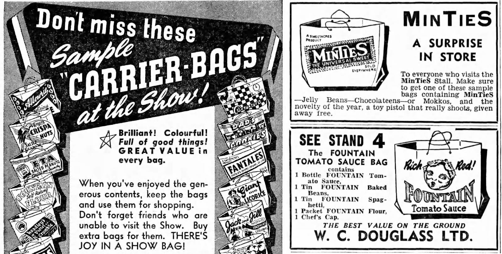 Those free sample bags were such a hit, in fact, that the vendors started charging money for them. If anything, that made sample bags even more popular. “What is there about the samples at the Show which causes us to succumb to their lure, making of ourselves beasts of burden?,” asked a piece in the Melbourne Sun News-Pictorial in 1927. “It seems impossible to escape the collecting fever. Our bags and bundles were matched by dozens of others in the homeward-bound train.”