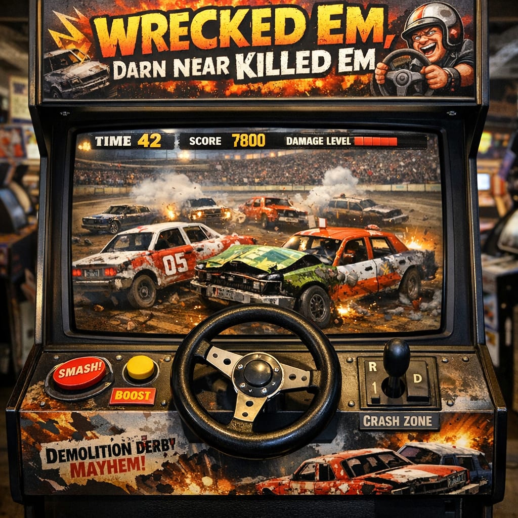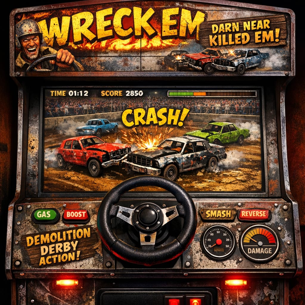 @medz Here’s the image you requested for “arcade game called wreck em, darn near killed em that has a steering wheel for the controller and…”