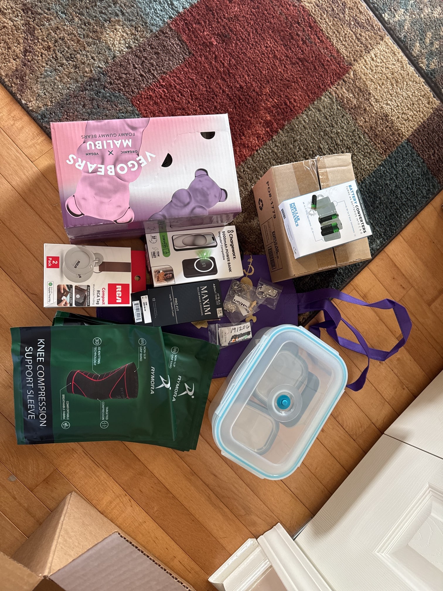 got 3 knee sleeves, expired vegan gummies, a humidifier in a beat up box, and a non-electric bidet. Who doesn’t want cold tap water up their behind?