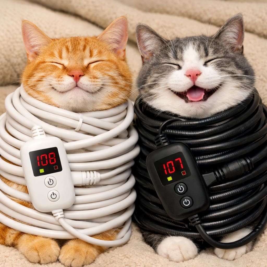 /showme happy cats wrapped in electric warmer cords