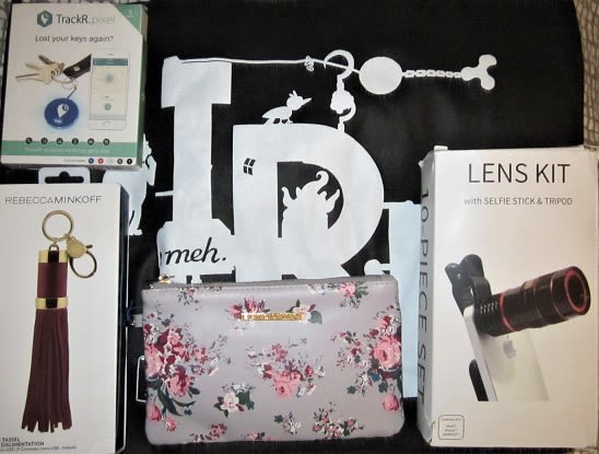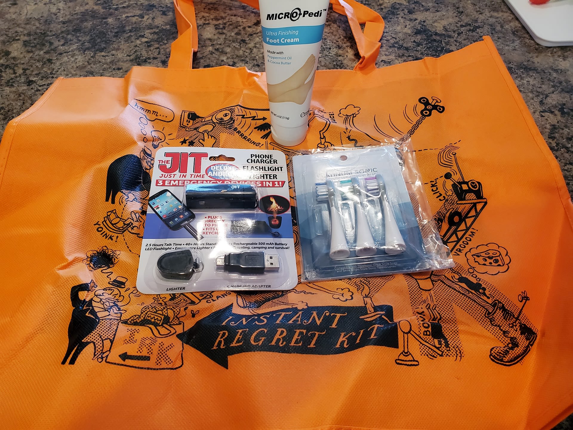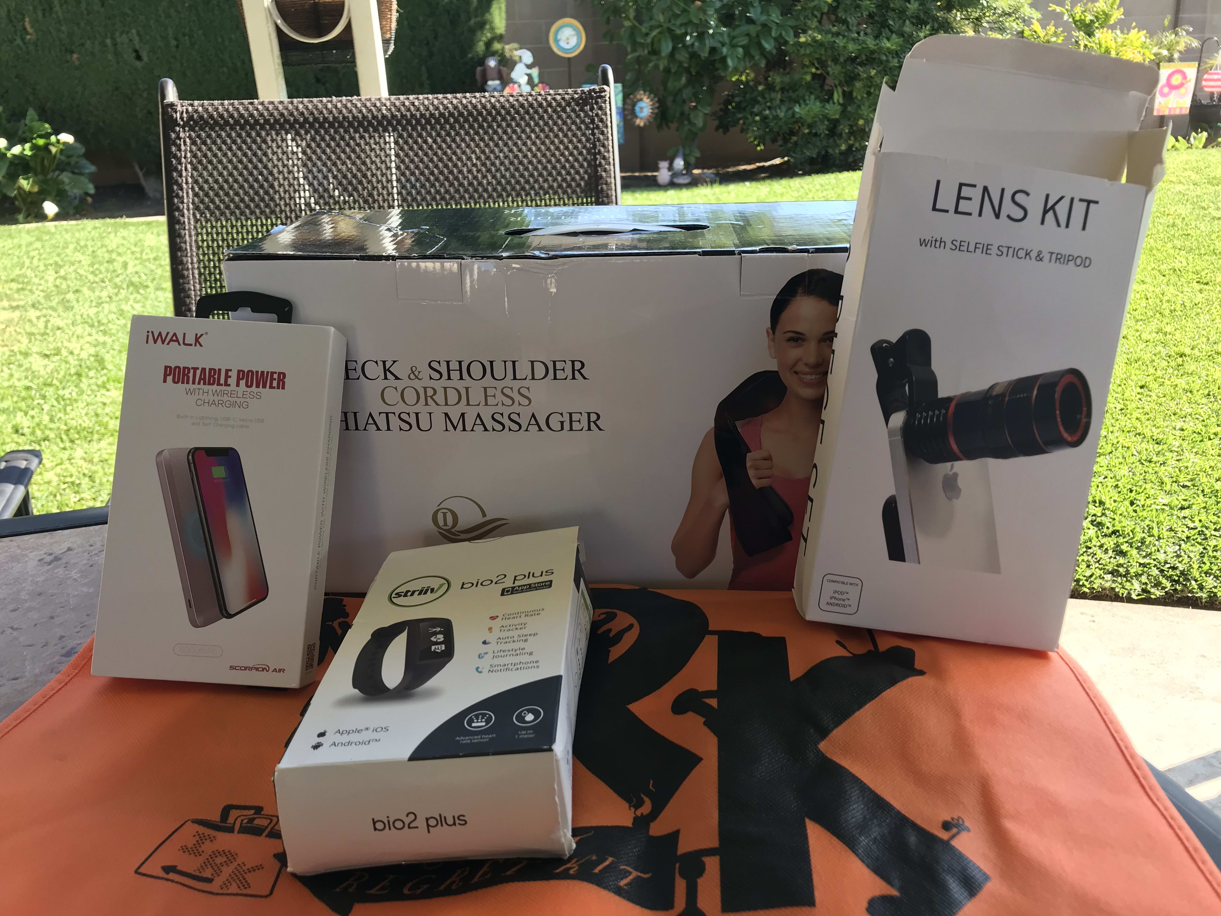 Also included: 3-pack Platinum Sonic toothbrush heads, 3-pack Charging Essentials mini wifi smart plugs, a “10-piece Set” selfie stick/telephoto lens/mini tripod kit for cell phones, and of course the ubiquitous IRK bag. Not the best mystery box I’ve ever received, but pretty darned good.