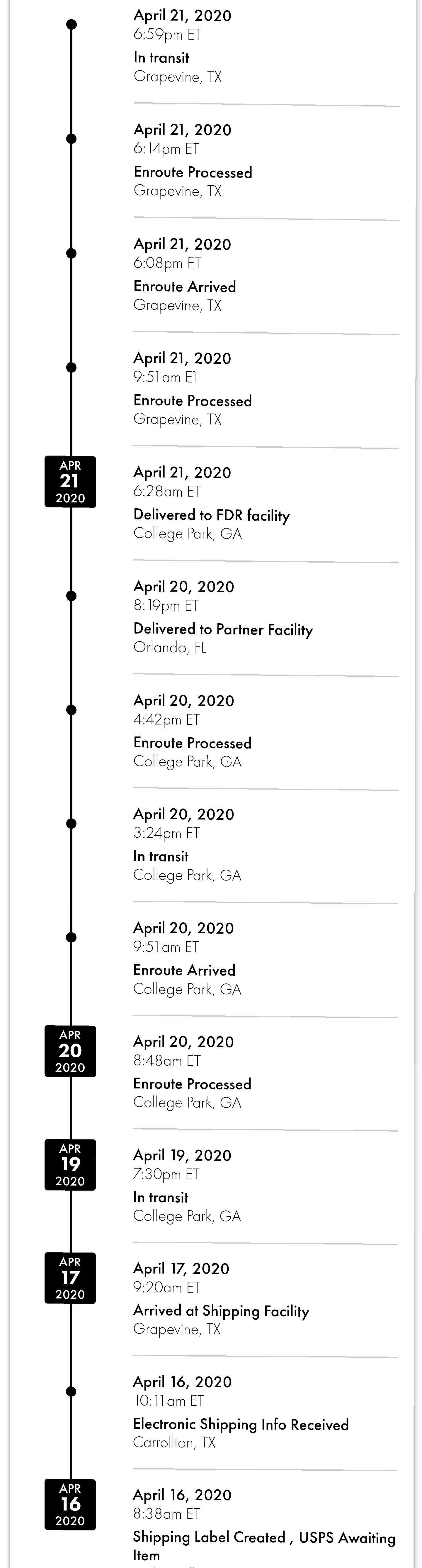 Am I the only one who hasn’t received the Sidedeal IRK yet? It left Carrollton early on 4/16. Five days later it stumbled into Grapevine late afternoon on the 20th. Got transferred around three times before it finally departed Grapevine, passed me by and arrived in Los Angeles on the 23rd. 40 winks, shower and shave then it left Los Angeles on the 24th. That’s when it went dark. No word since it left L.A. about midnight on the 24th.